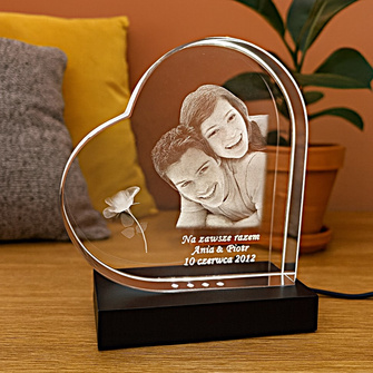 Kryształowa statuetka serce 3D z grawerem pary na podstawce LED – ekskluzywny prezent ślubny