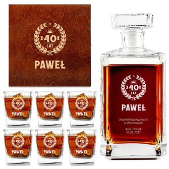 Karafka i 6 szklanek w drewnianej skrzyni z grawerem Z OKAZJI 40 URODZIN