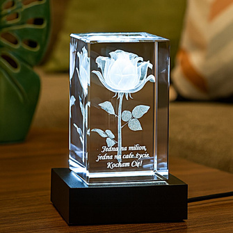 Statuetka szklana LED z grawerunkiem róży 3D i dedykacją – prezent na walentynki lub rocznicę