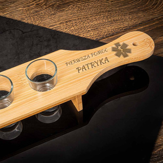 Zestaw to shotów - deska i 6 kieliszków z grawerem PIERWSZA POMOC + IMIE
