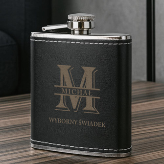 Piersiówka z grawerem dla świadka – WYBORNY ŚWIADEK, czarna skóra, prezent ślubny