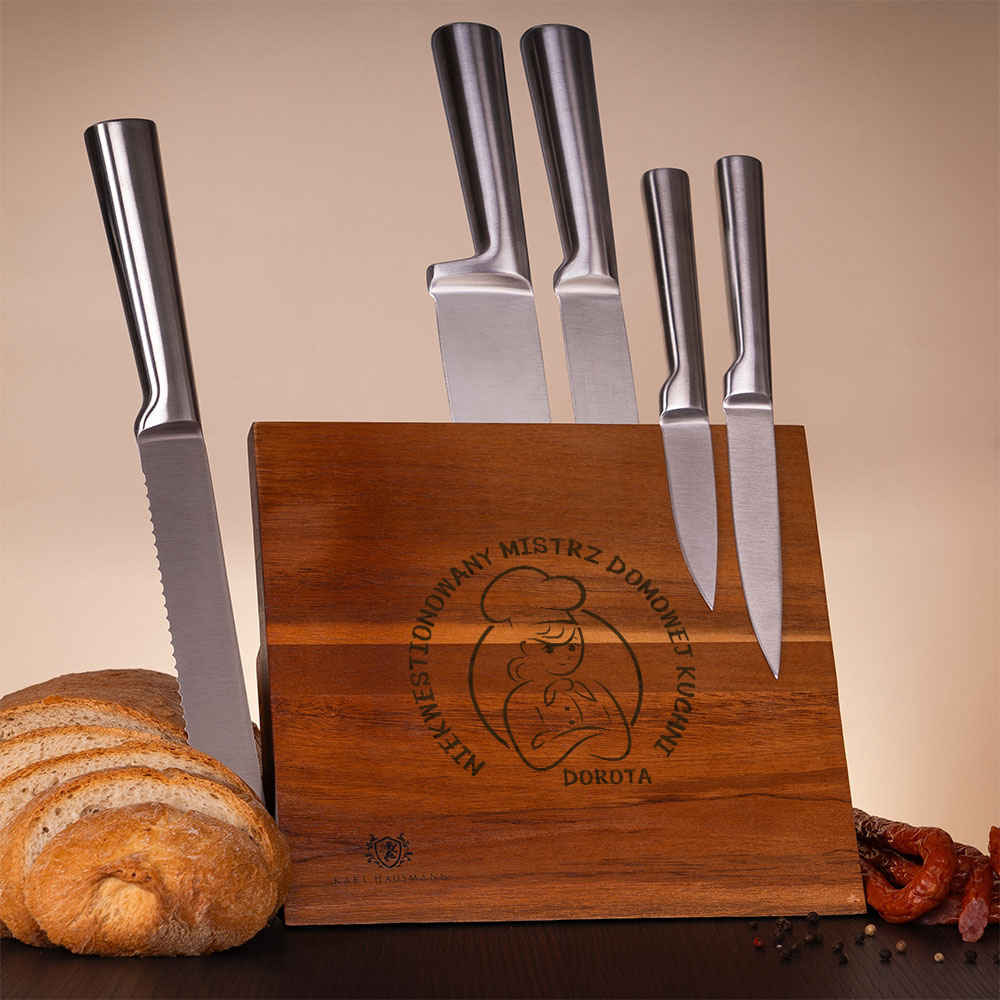 - Elegancki zestaw noży kuchennych z grawerem na magnetycznym bloku to wyjątkowy prezent dla kobiety – siostry, żony, koleżanki lub teściowej. Personalizacja laserowa nadaje mu unikalny charakter i sentymentalną wartość.