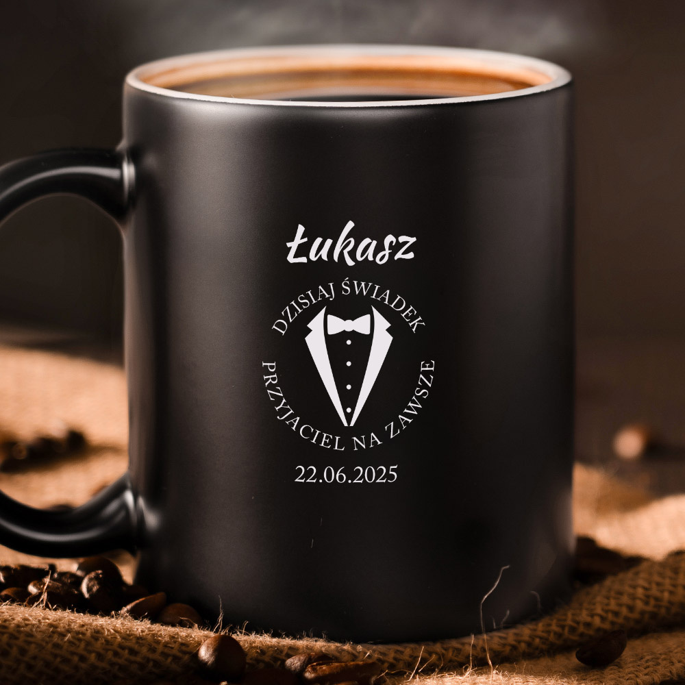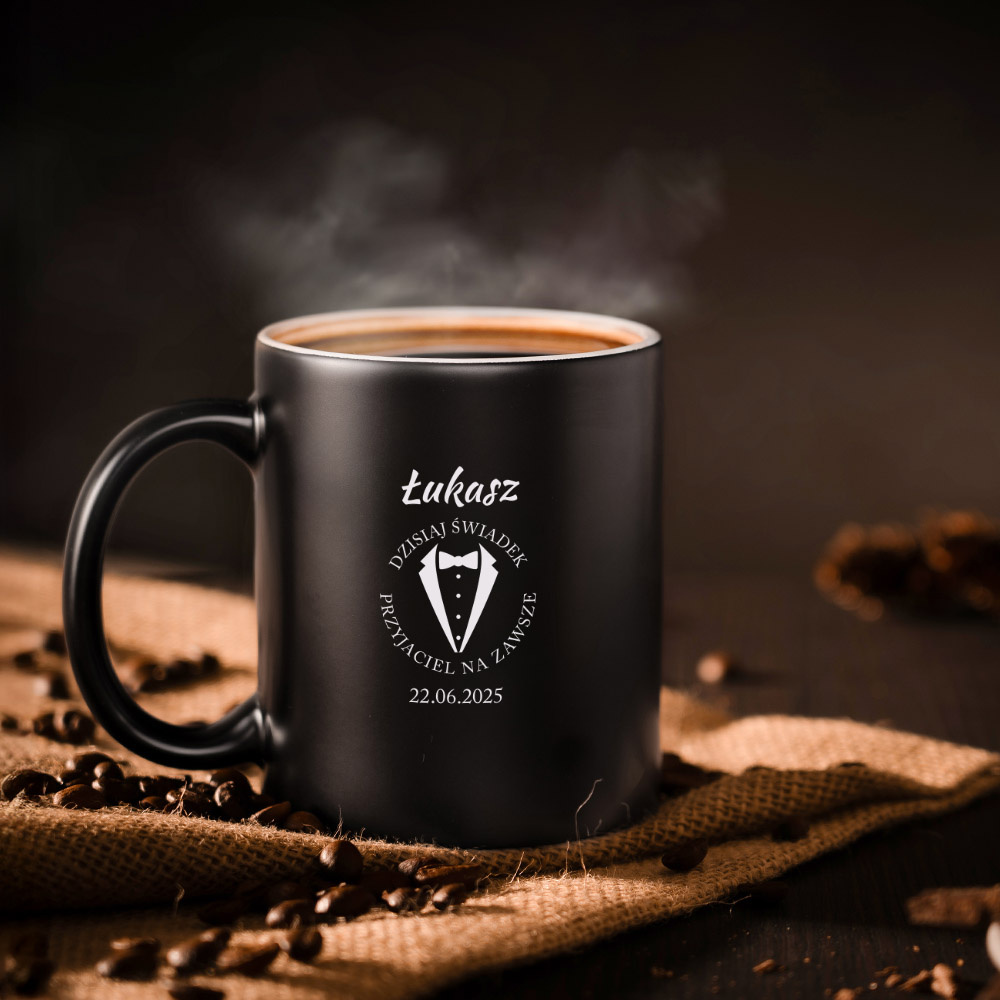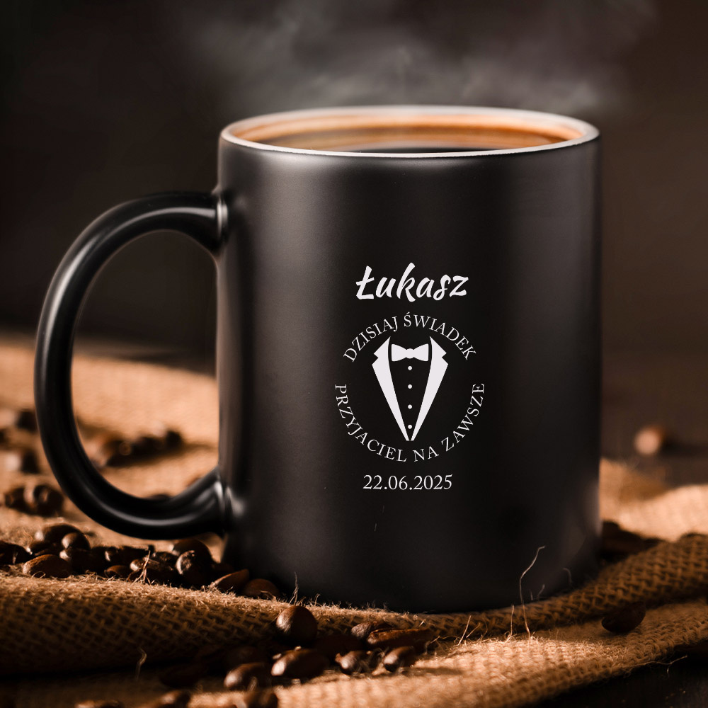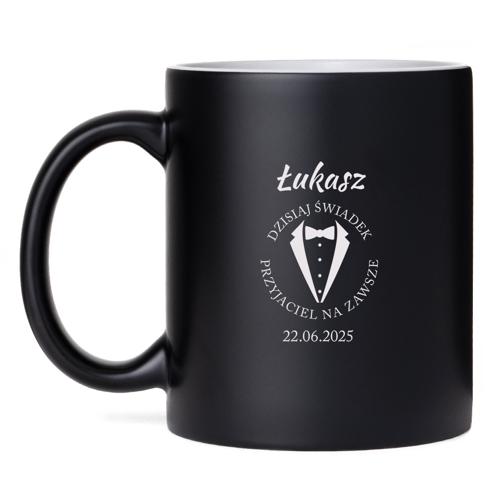 - Elegancki czarny kubek z matowej ceramiki z grawerem imienia, daty i słów „Dzisiaj Świadek, Przyjaciel na zawsze”. Oryginalny sposób na podziękowania od Pary Młodej.