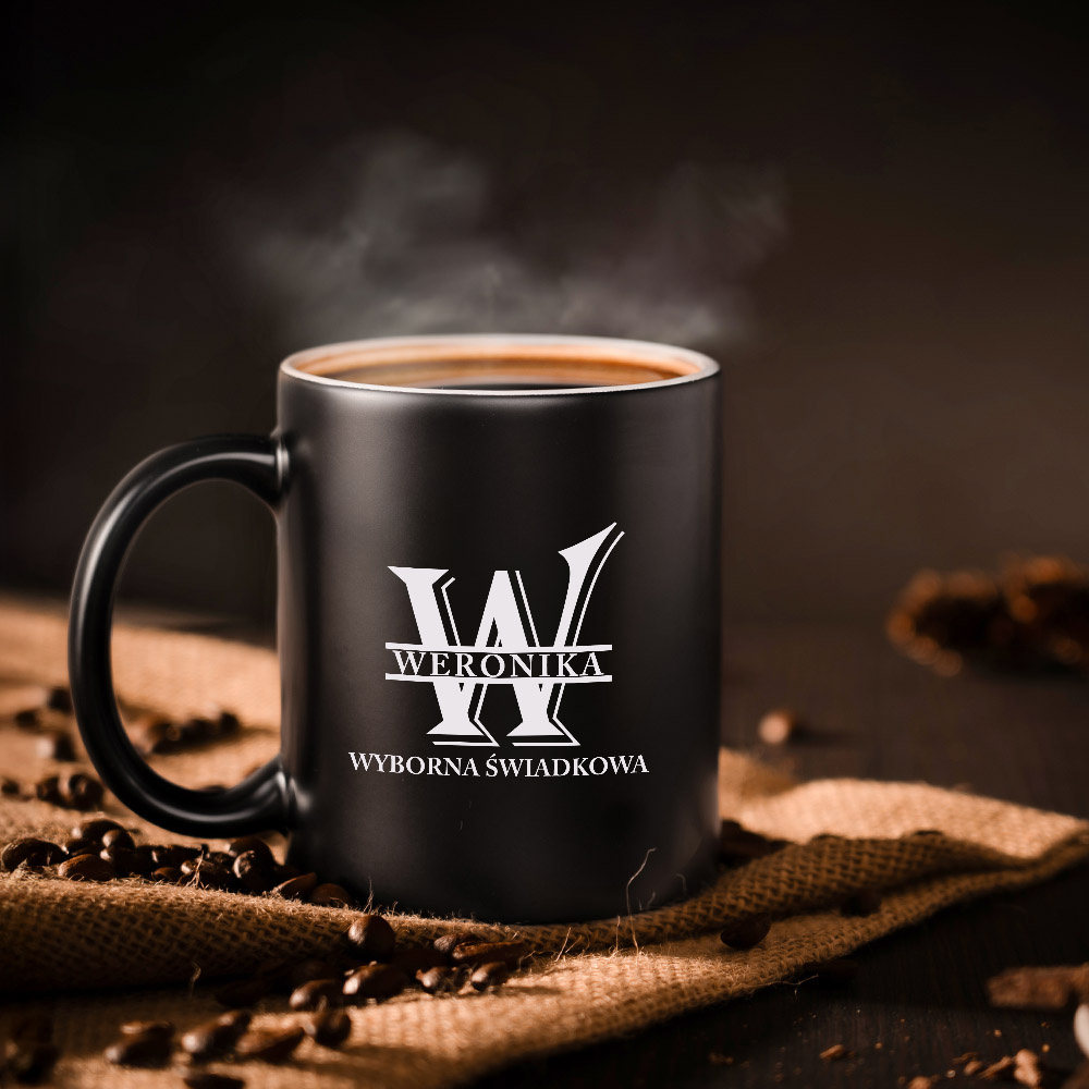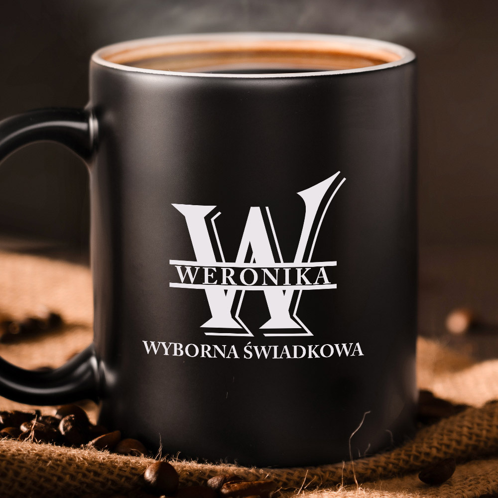 • Stylowy czarny kubek ceramiczny z matowym wykończeniem i grawerem imienia oraz tekstem „Wyborna Świadkowa”. Idealny prezent i podziękowanie dla świadkowej.