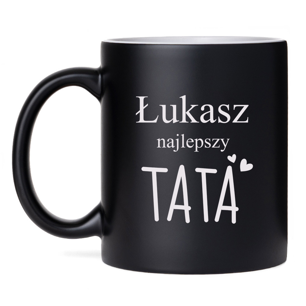 • Stylowy czarny kubek ceramiczny z matowym wykończeniem i grawerem „Najlepszy Tata” oraz imieniem. Idealny prezent dla taty na każdą okazję.