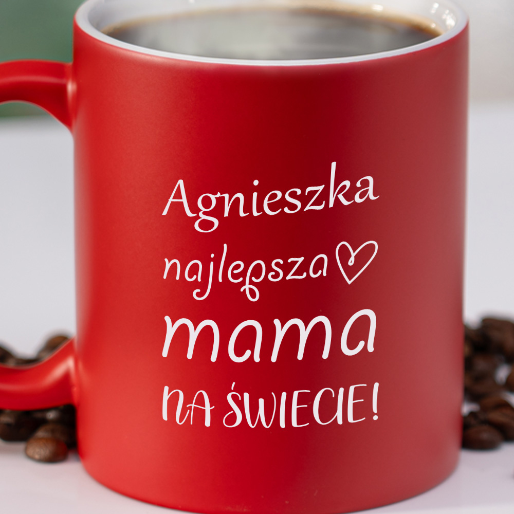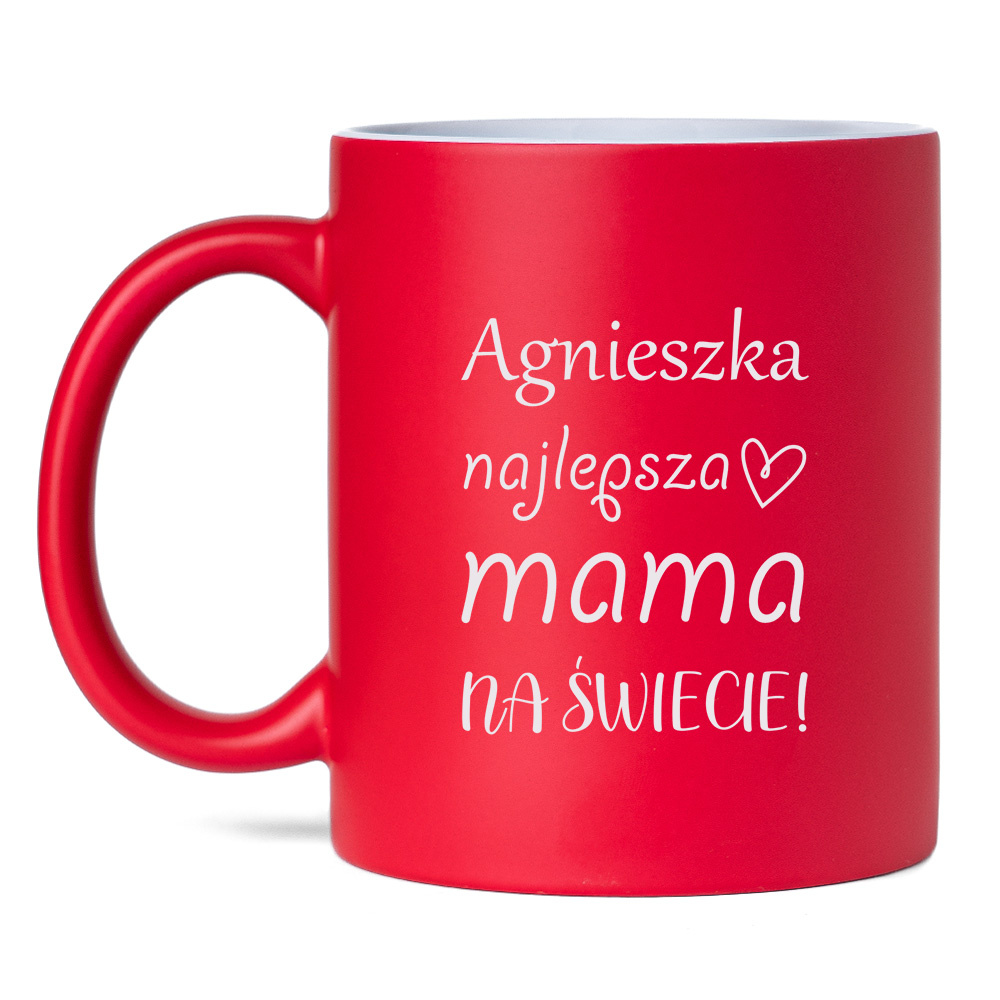• Elegancki czerwony kubek ceramiczny z matowym wykończeniem i grawerem laserowym. Z imieniem mamy i napisem „najlepsza mama na świecie”. Idealny, personalizowany prezent.
