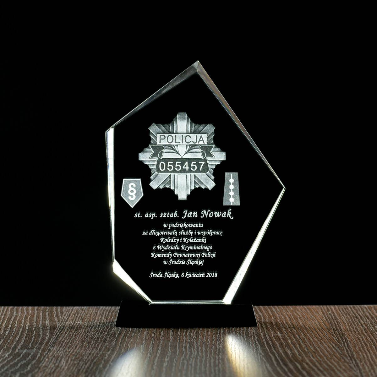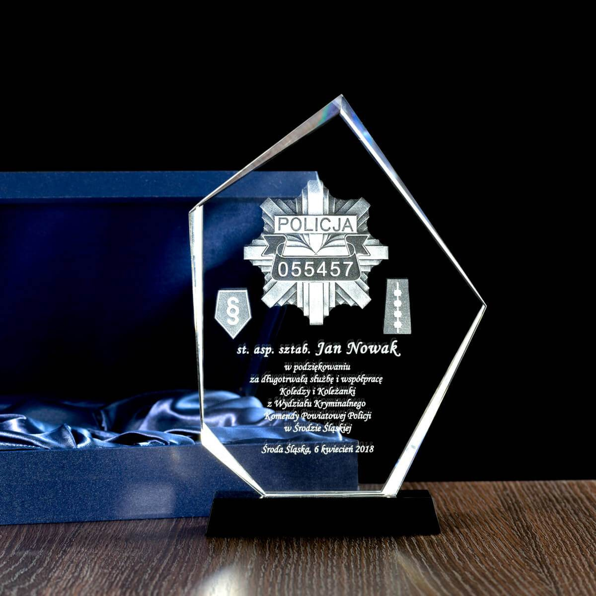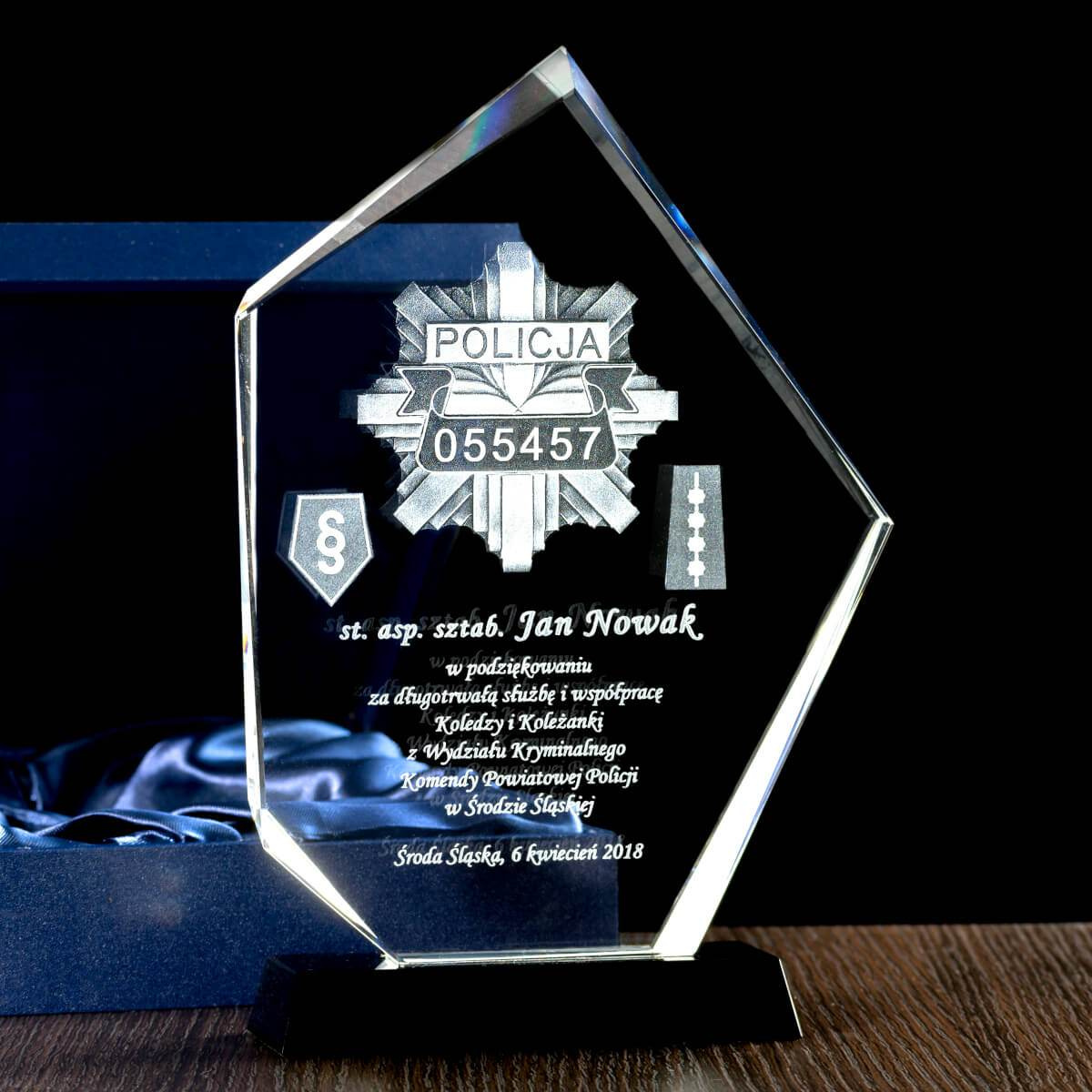 • Wyjątkowa kryształowa statuetka z personalizowaną odznaką policyjną i dedykacją. Idealny prezent na odejście na emeryturę jako podziękowanie za lata służby.