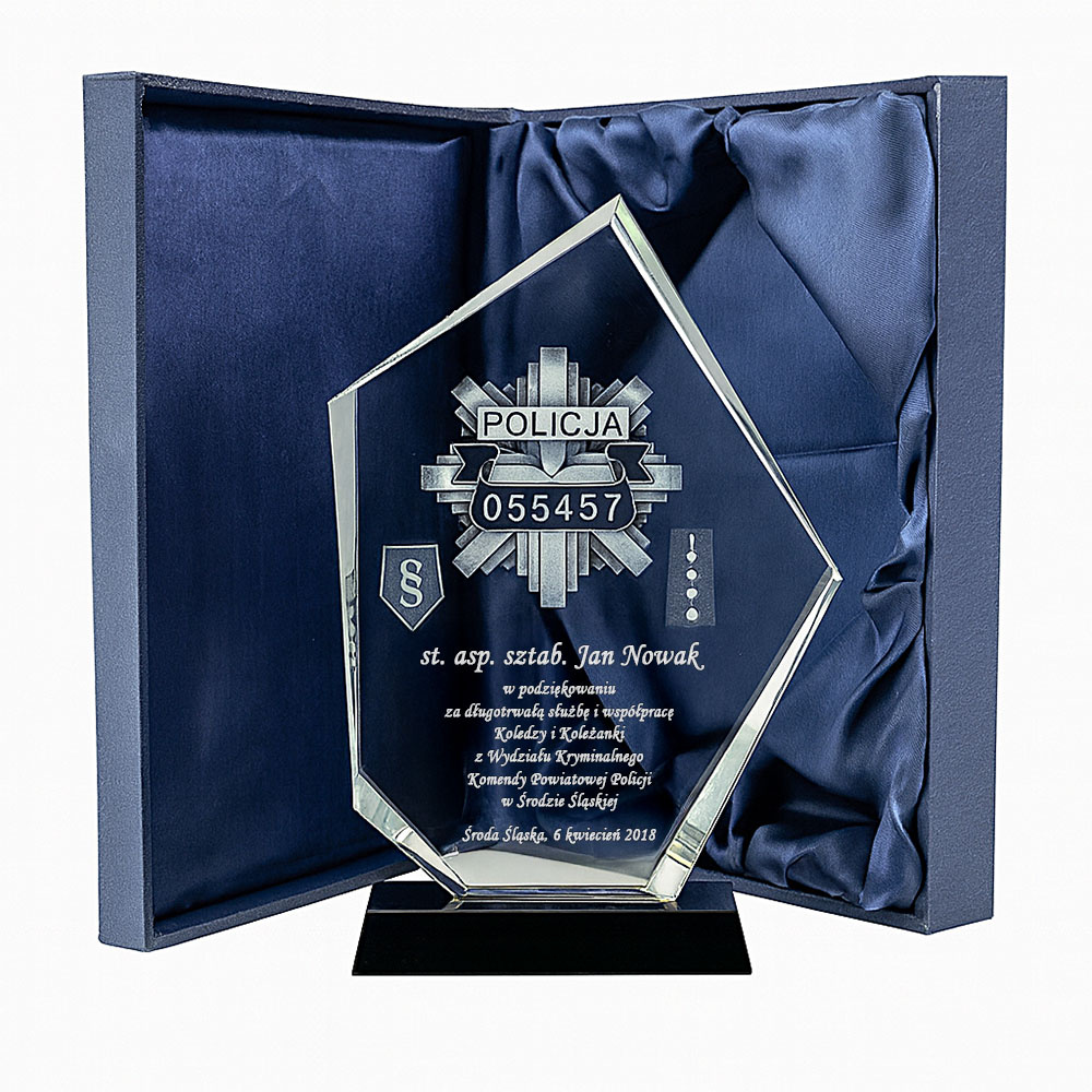 Statuetka wykonana jest z wysokiej jakości kryształu. W przezroczystej części nanosimy precyzyjny grawer 3D odznaki policyjnej, stopniami oraz indywidualnym tekstem — imieniem, nazwiskiem, datą odejścia na emeryturę lub osobistym podziękowaniem. Całość uzupełnia solidna podstawa z czarnego kryształu, która dodaje elegancji i podkreśla rangę prezentu. Gotowa statuetka pakowana jest w eleganckie etui, dzięki czemu prezent jest w pełni gotowy do wręczenia podczas uroczystego pożegnania. To trwała pamiątka, która na lata przypomni o docenieniu i szacunku za pełnioną służbę.