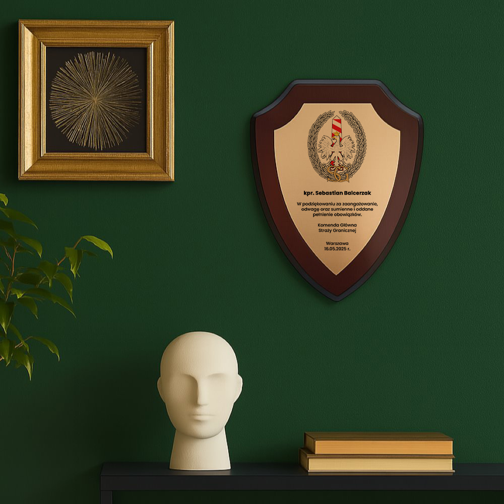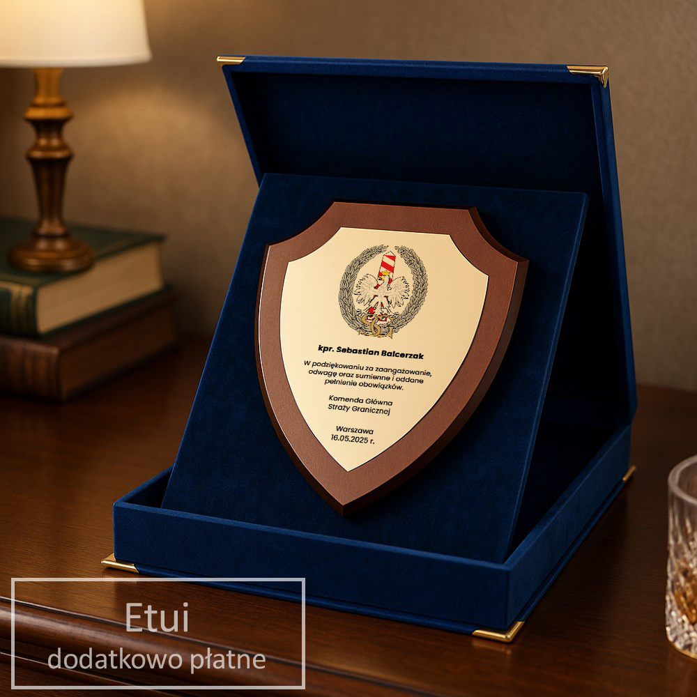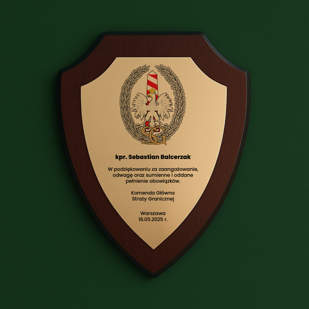Dyplom w formie tarczy z orzełkiem Straży Granicznej to wyjątkowy sposób, by wyrazić szacunek i wdzięczność żołnierzowi odchodzącemu ze służby lub obchodzącemu jubileusz. Personalizowana blaszana tabliczka zawiera stopień, imię i nazwisko oraz wzruszającą dedykację: „W podziękowaniu za zaangażowanie, odwagę oraz sumienne i oddane pełnienie obowiązków”. Całość umieszczona na solidnym podkładzie MDF z otworem na tylnej stronie do zawieszenia. Dostępne etui z podstawką w kolorze granatowym lub bordowym.