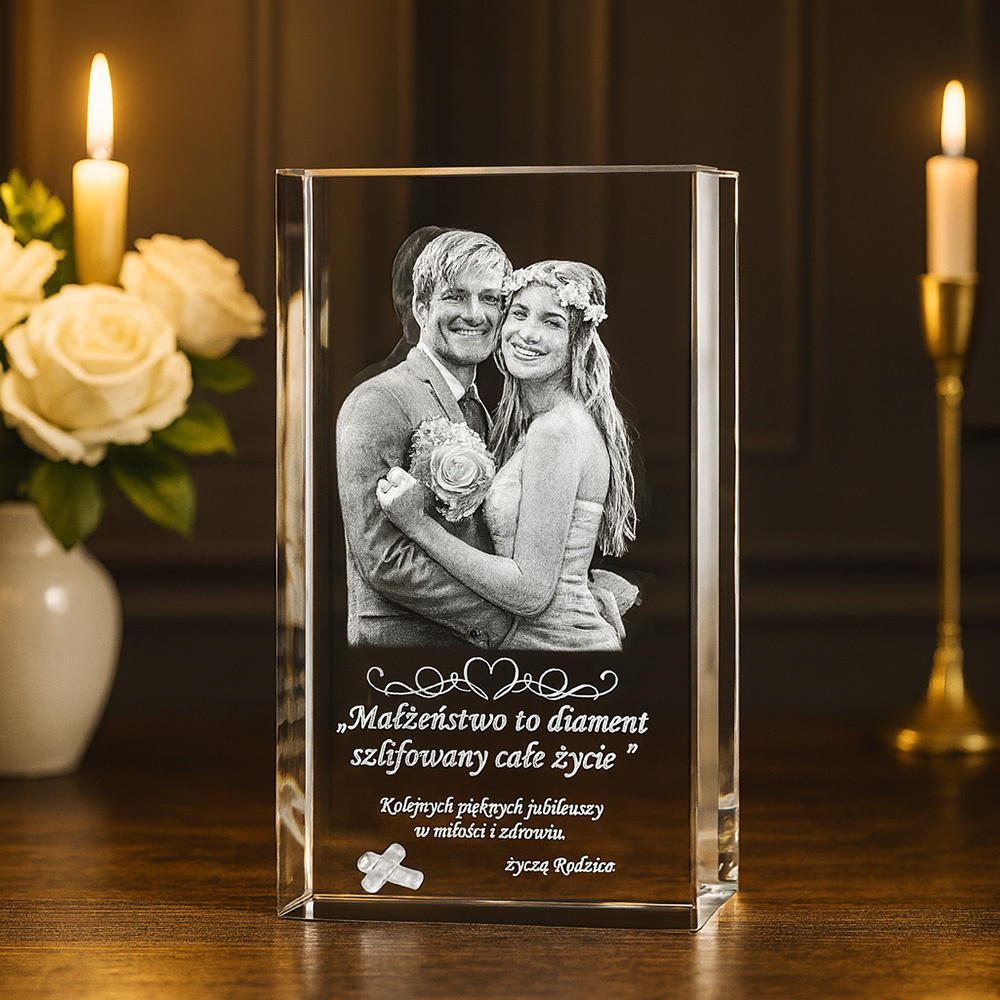 - Fotokryształ 3D to pomysł na prezent na rocznicę ślubu lub prezent ślubny. Wygrawerowane trójwymiarowe zdjęcie pary, ich obrączki i dedykacja sprawią, że to wyjątkowy upominek. Dla par świętujących 10, 20, 30, 40 lub nawet 50 lat małżeństwa.