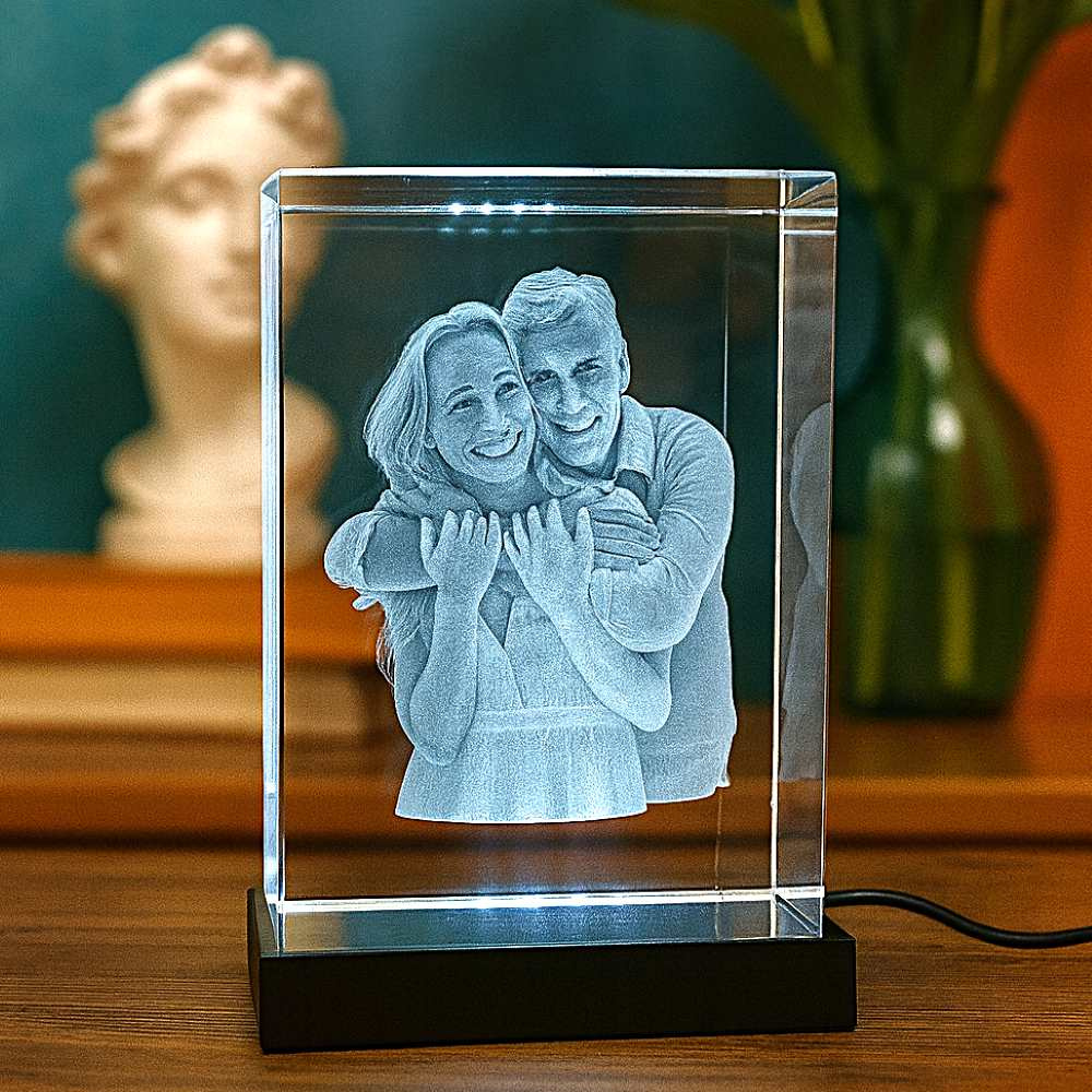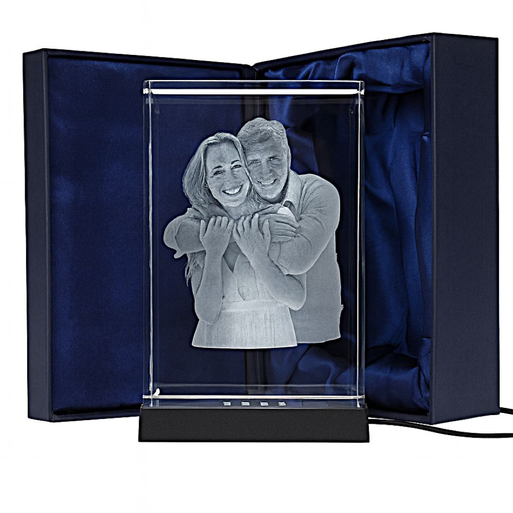 - Okazała statuetka kryształowa 3D z przestrzennym grawerunkiem zdjęcia pary osób. W zestawie elegancka podstawka LED, która podkreśla głębię grawerunku i zamienia statuetkę w nastrojową lampkę nocną. Idealny prezent na rocznicę ślubu.