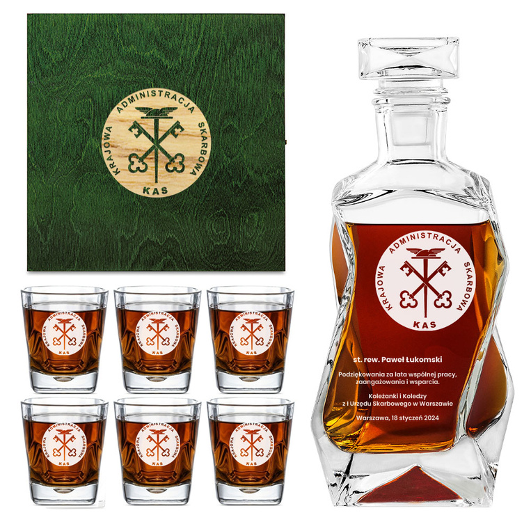 - Elegancki zestaw karafki i sześciu szklanek w drewnianej skrzynce, ozdobiony logotypem KAS. Wyjątkowy prezent dla pracownika Krajowej Administracji Skarbowej z okazji emerytury lub podziękowania za lata pracy.
