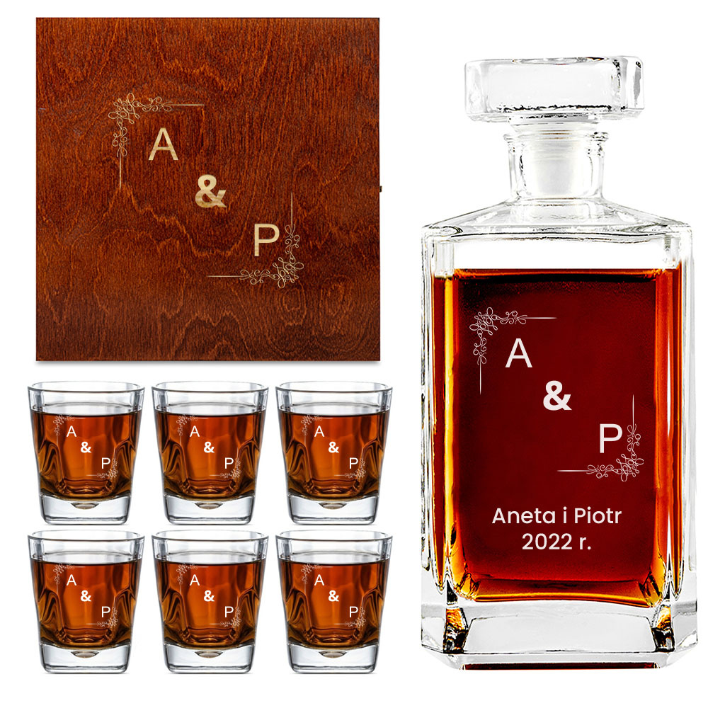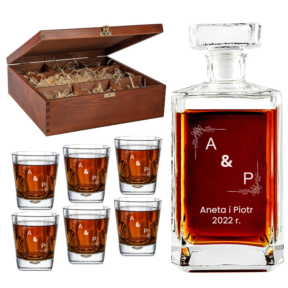 - Personalizowany zestaw do degustacji złożony z karafki i 6 szklanek, zapakowany w piękną drewnianą skrzynkę. Każdy element z indywidualnym grawerem, co czyni go wyjątkowym i niepowtarzalnym. Praktyczny prezent dla miłośnika single malt i blendów.