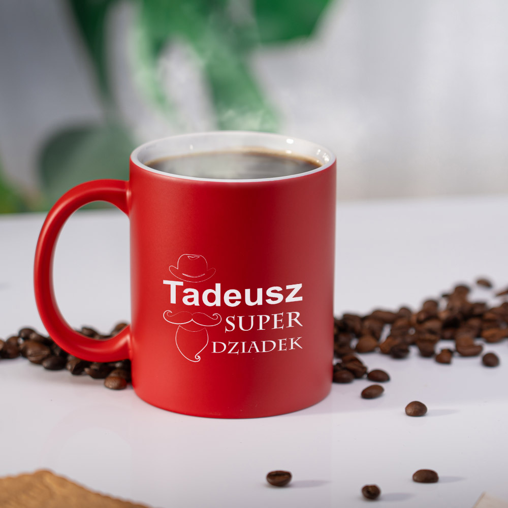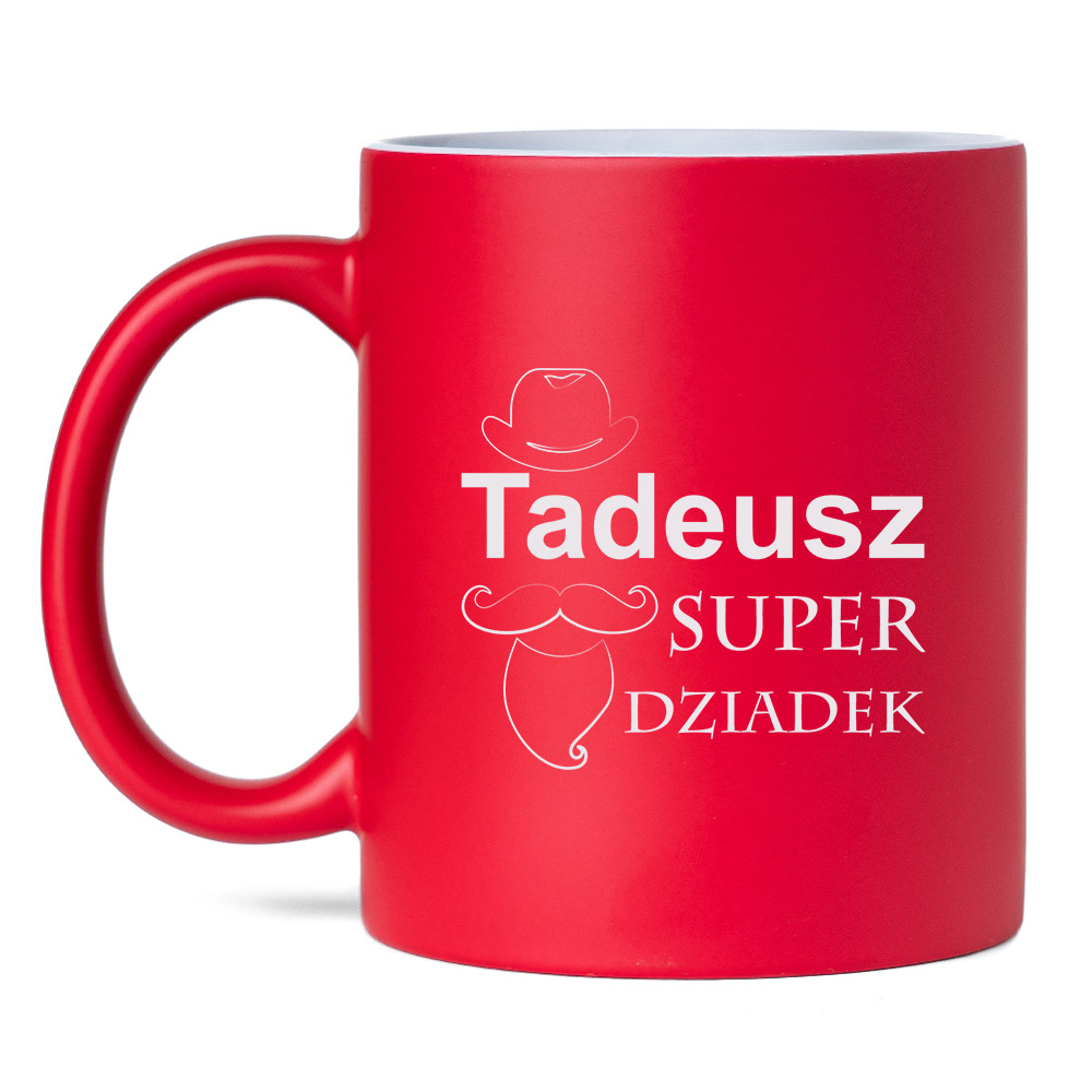 - Czerwony kubek ceramiczny w matowym wykończeniu z grawerem „SUPER DZIADEK”. Personalizacja imieniem dziadka sprawia, że to idealny upominek na każdą okazję.