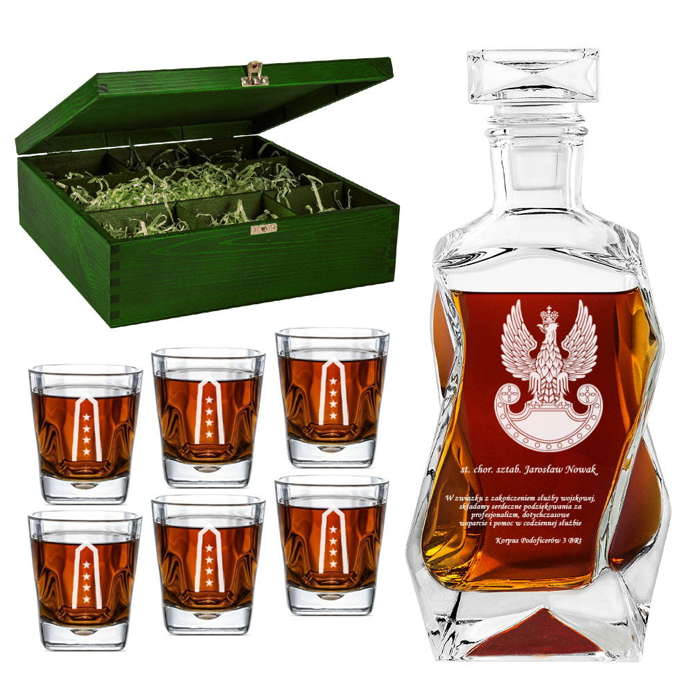 - Zestaw do whisky w eleganckiej, zielonej skrzynce z personalizacją. Karafka oraz 6 szklanek ozdobionych grawerem laserowym. Skrzynka i karafka z imieniem, nazwiskiem, stopniem oraz orzełkiem.