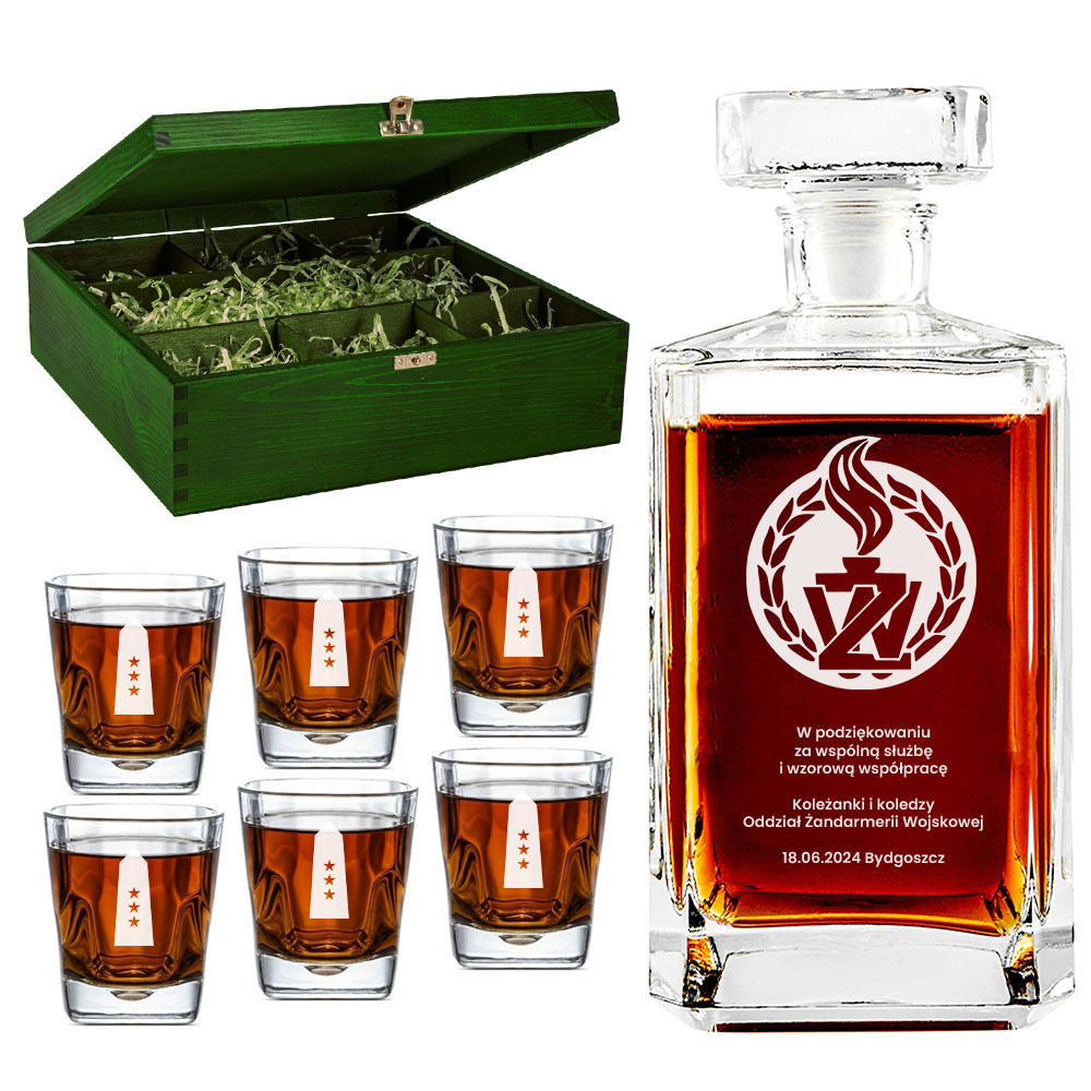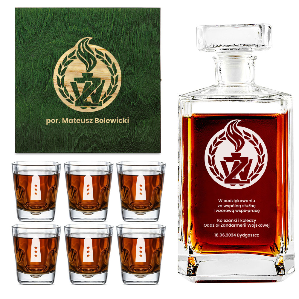 - Elegancki zestaw z grawerowaną karafką i szklankami w drewnianej skrzynce, idealny prezent dla żołnierza Żandarmerii Wojskowej przechodzącego na emeryturę. Grawer laserowy z dedykacją i logotypem ŻW.