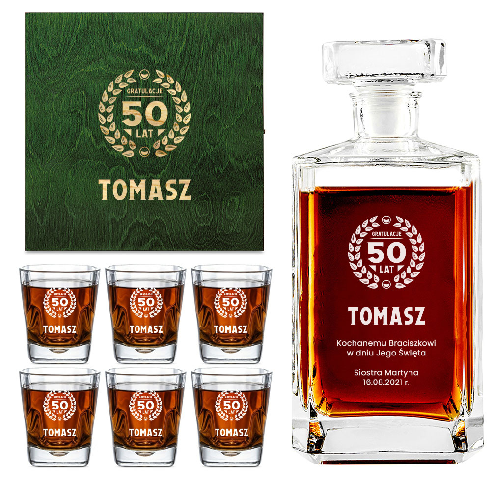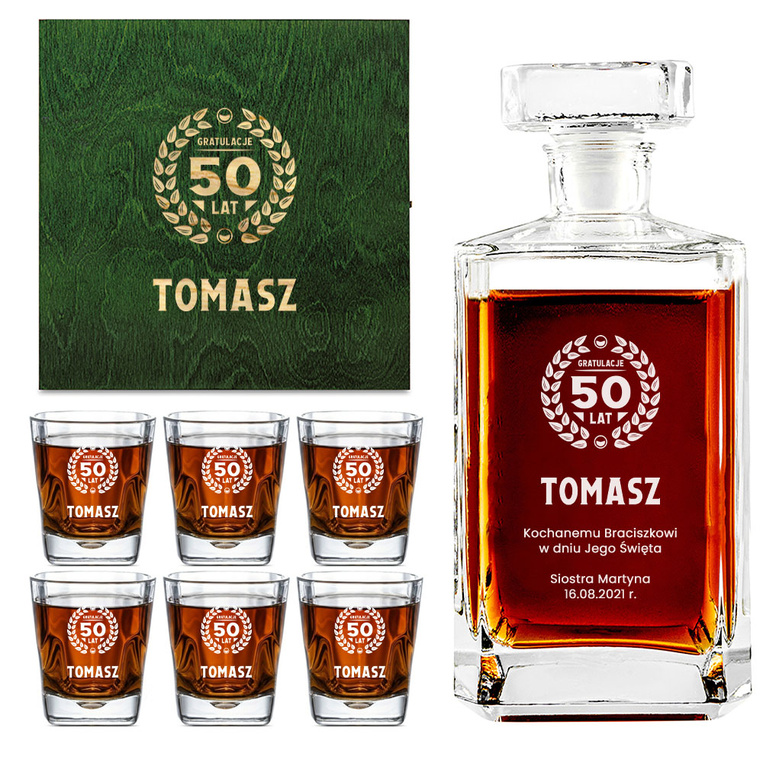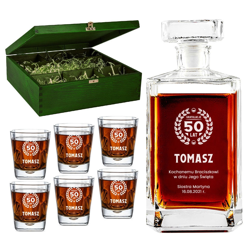 - Elegancki zestaw do whisky, który zawiera karafkę oraz 6 szklanek, zapakowany w zieloną, drewnianą skrzynkę. Każdy element został starannie wygrawerowany, tworząc wyjątkowy prezent na urodziny dla brata, przyjaciela czy kolegi z pracy.