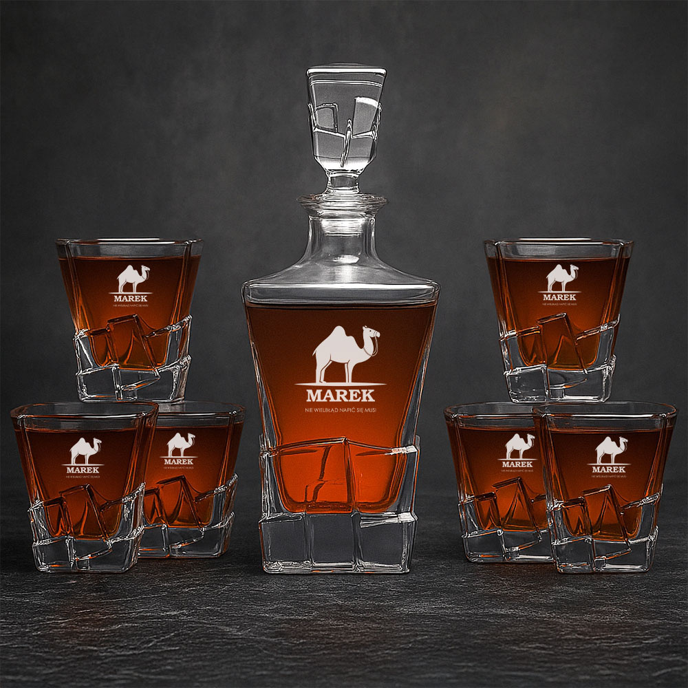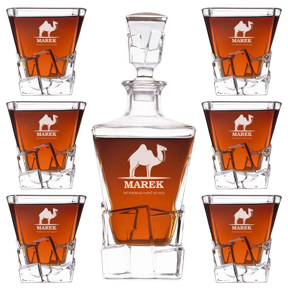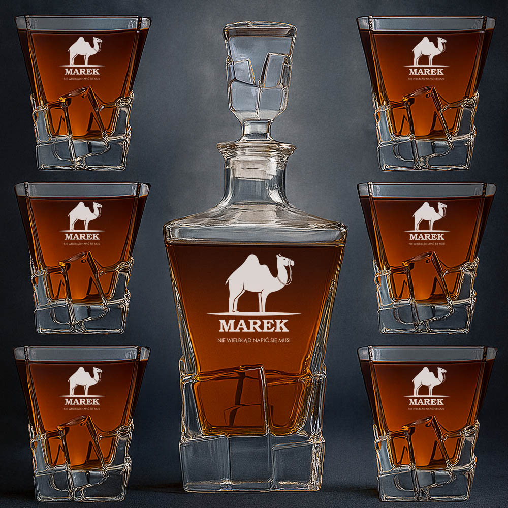 - Karafka i 6 szklanek lodowych z zabawnym grawerem wielbłąda i napisem: „[IMIĘ] NIE WIELBŁĄD NAPIĆ SIĘ MUSI”. Ciężkie, efektowne szkło – świetny prezent na urodziny, wieczór kawalerski lub dla kolegi z pracy.