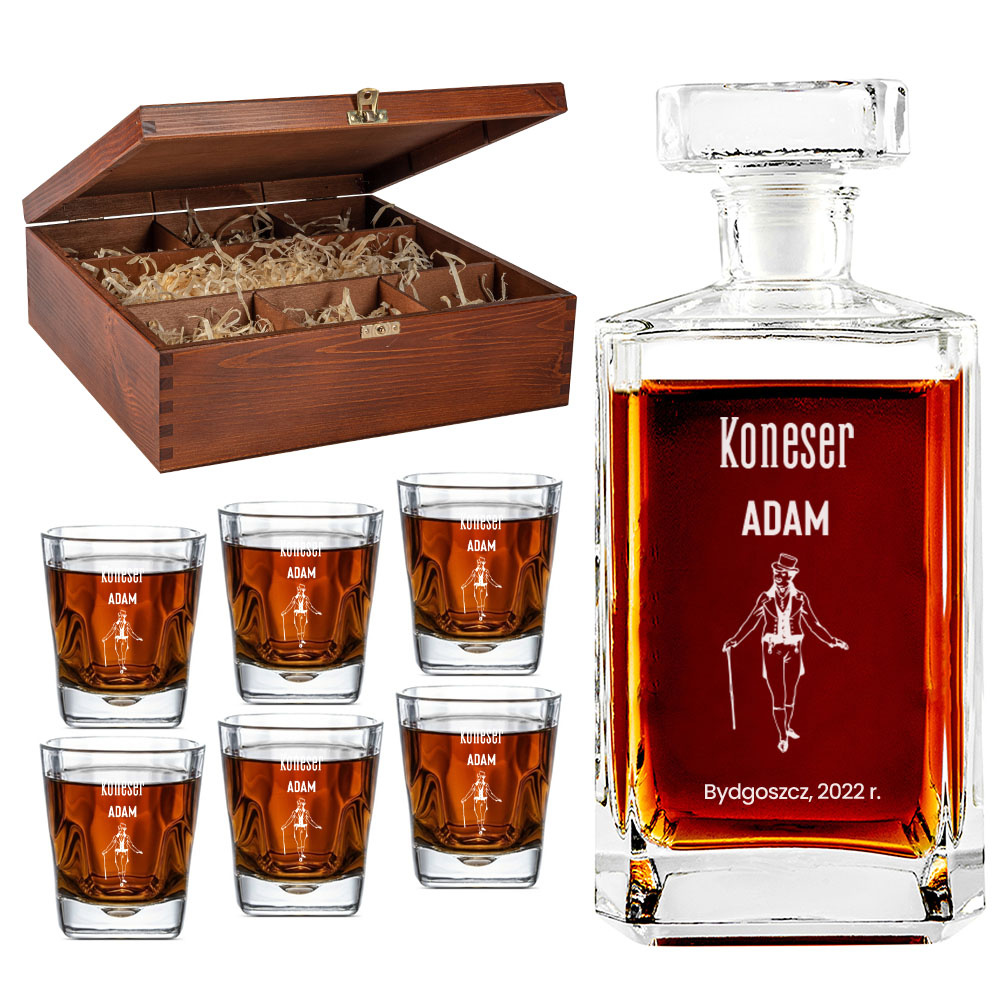Karafka i 6 szklanek w drewnianej skrzynce z grawerem DLA KONESERA WHISKY