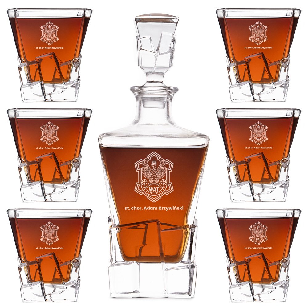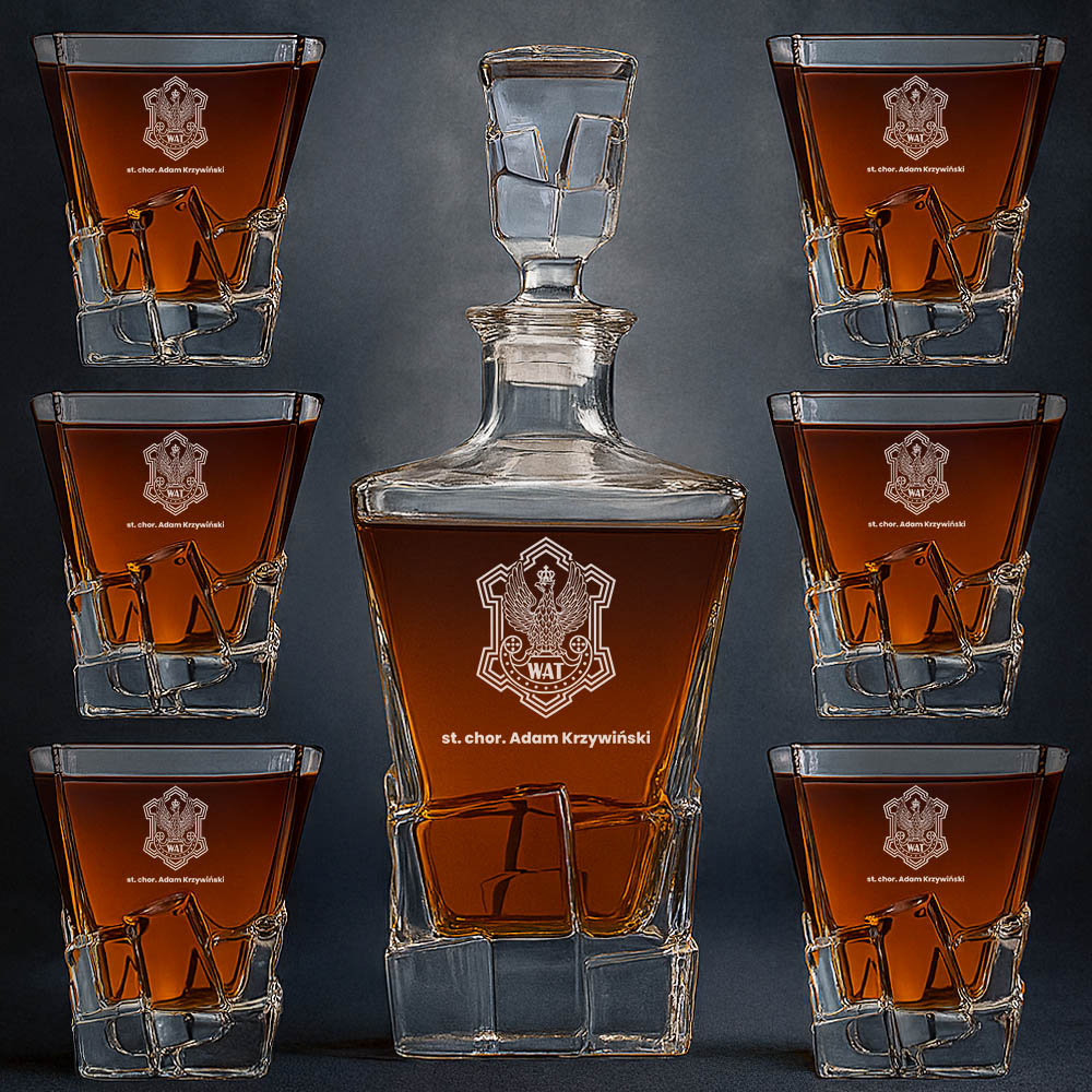 • Okazały zestaw lodowy z logo WAT – karafka i 6 szklanek z grawerem stopnia wojskowego oraz imienia i nazwiska. Stylowy, ciężki komplet na prezent dla absolwenta, kadeta lub instruktora WAT.