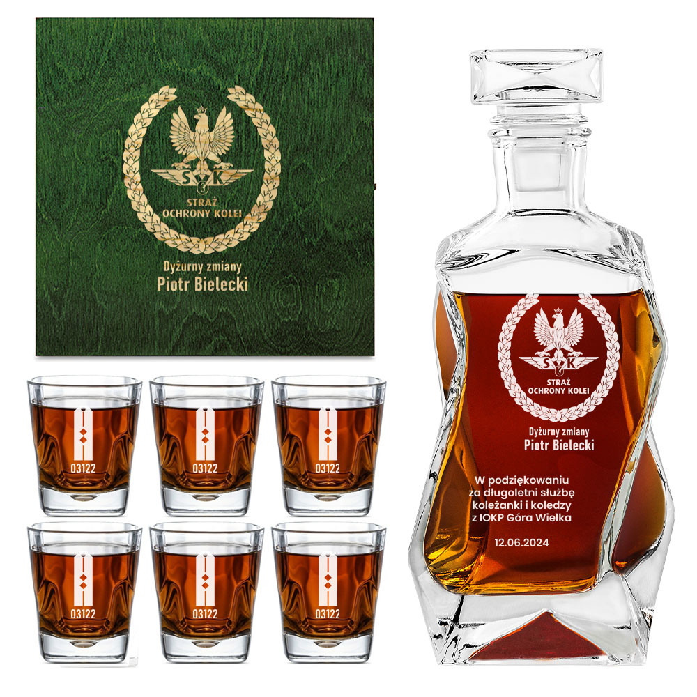 - Zestaw grawerowanej karafki i sześciu szklanek, zapakowany w drewnianą, zieloną skrzynkę, to doskonały prezent dla funkcjonariusza Straży Ochrony Kolei z okazji przejścia na emeryturę.