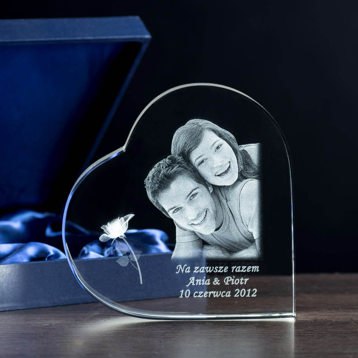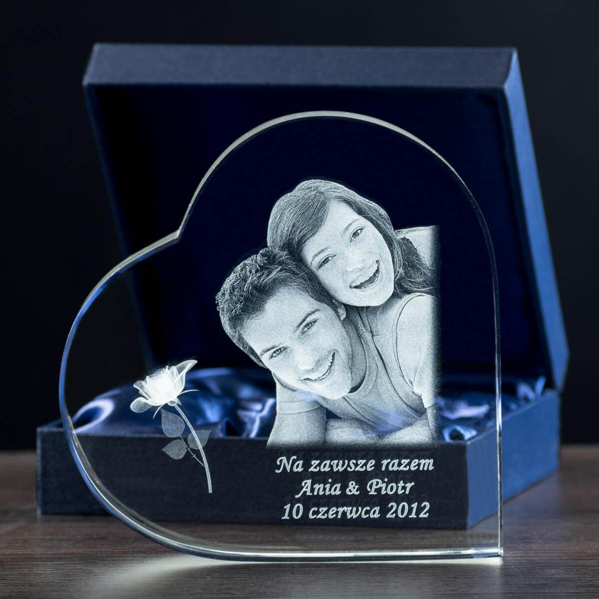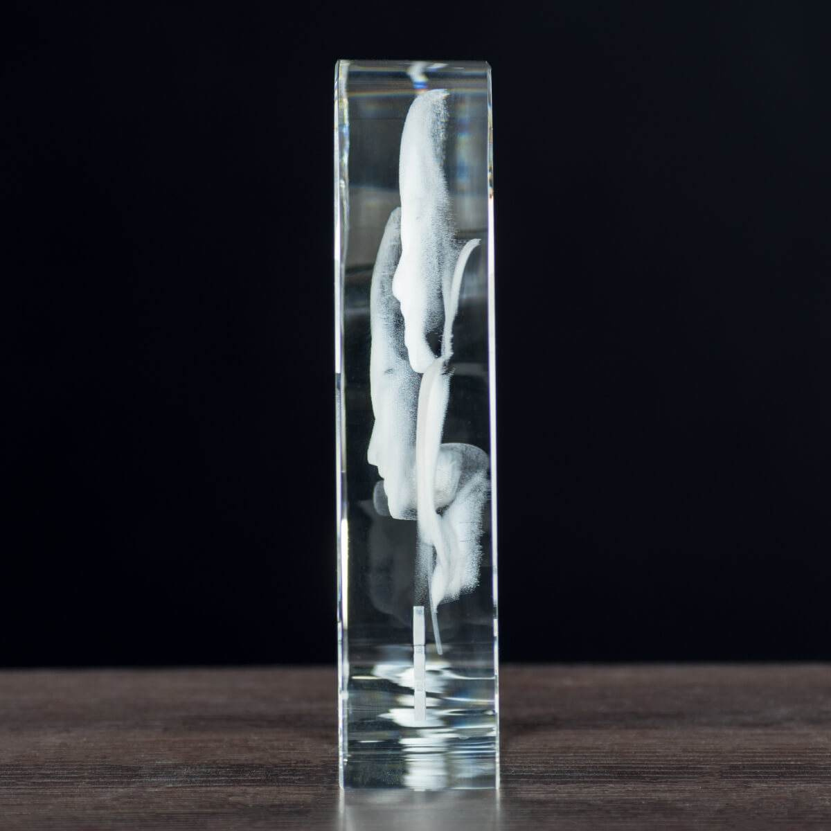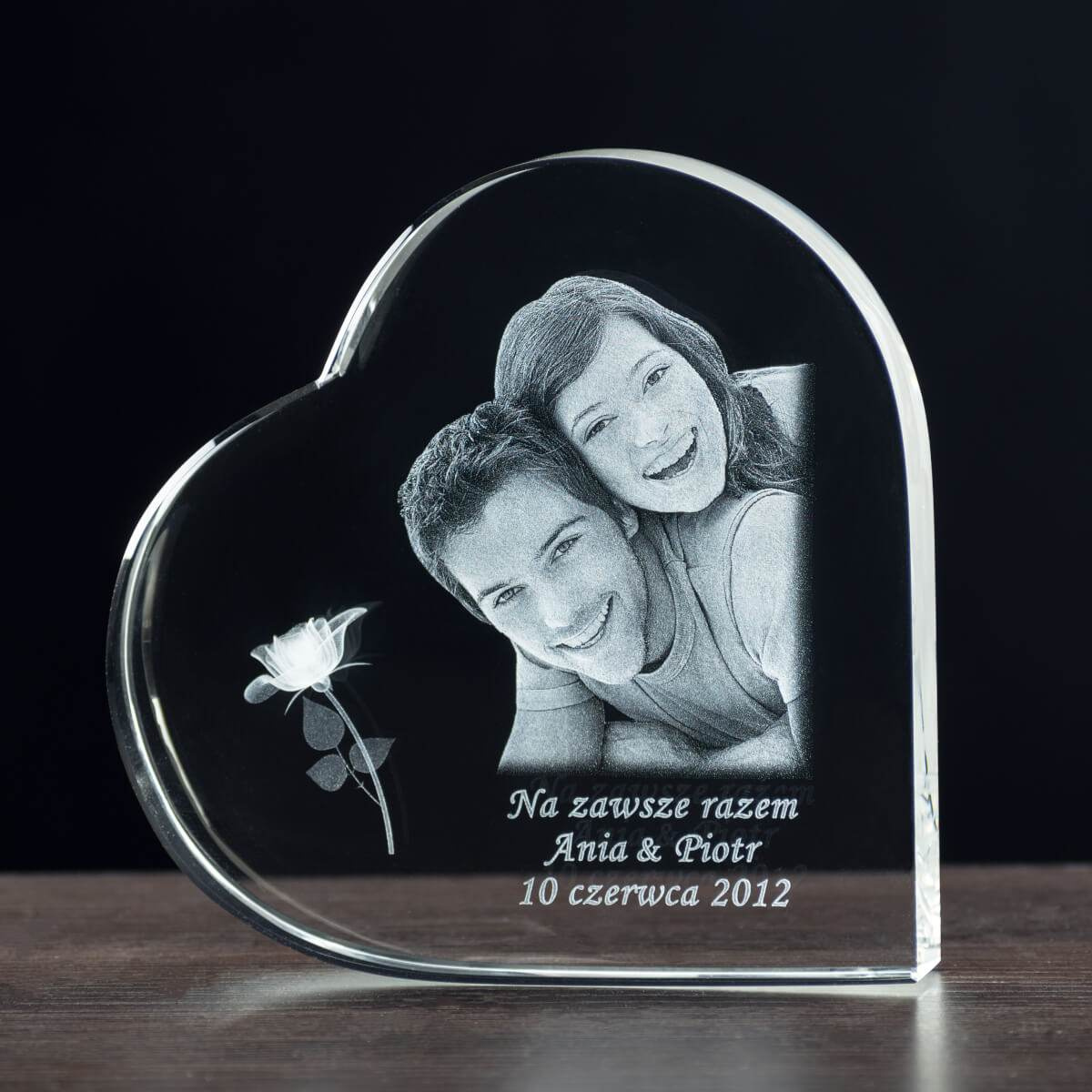 Statuetka kryształowa w kształcie serca to połączenie kunsztu i nowoczesnej technologii 3D. Wysokiej jakości kryształ o wymiarach 150×150×100 mm skrywa trójwymiarowy grawer przedstawiający wizerunek pary – wykonany z niezwykłą precyzją laserową.