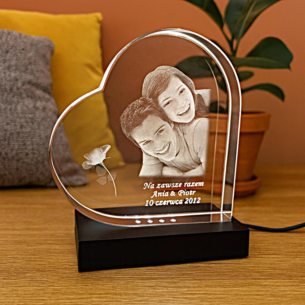 - Ekskluzywna statuetka z grawerunkiem 3D w szlachetnym krysztale. Podświetlana diodami LED tworzy subtelną fotolampkę, będąc eleganckim prezentem na ślub lub jubileusz.