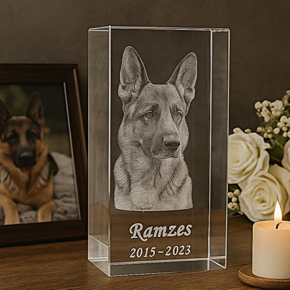 We wnętrzu kryształu o wymiarach 200×100×70 mm laser precyzyjnie odtwarza realistyczny portret pupila, a pod nim wygrawerowane zostaje imię i lata jego życia – tworząc niezwykłą pamiątkę po ukochanym zwierzaku.
