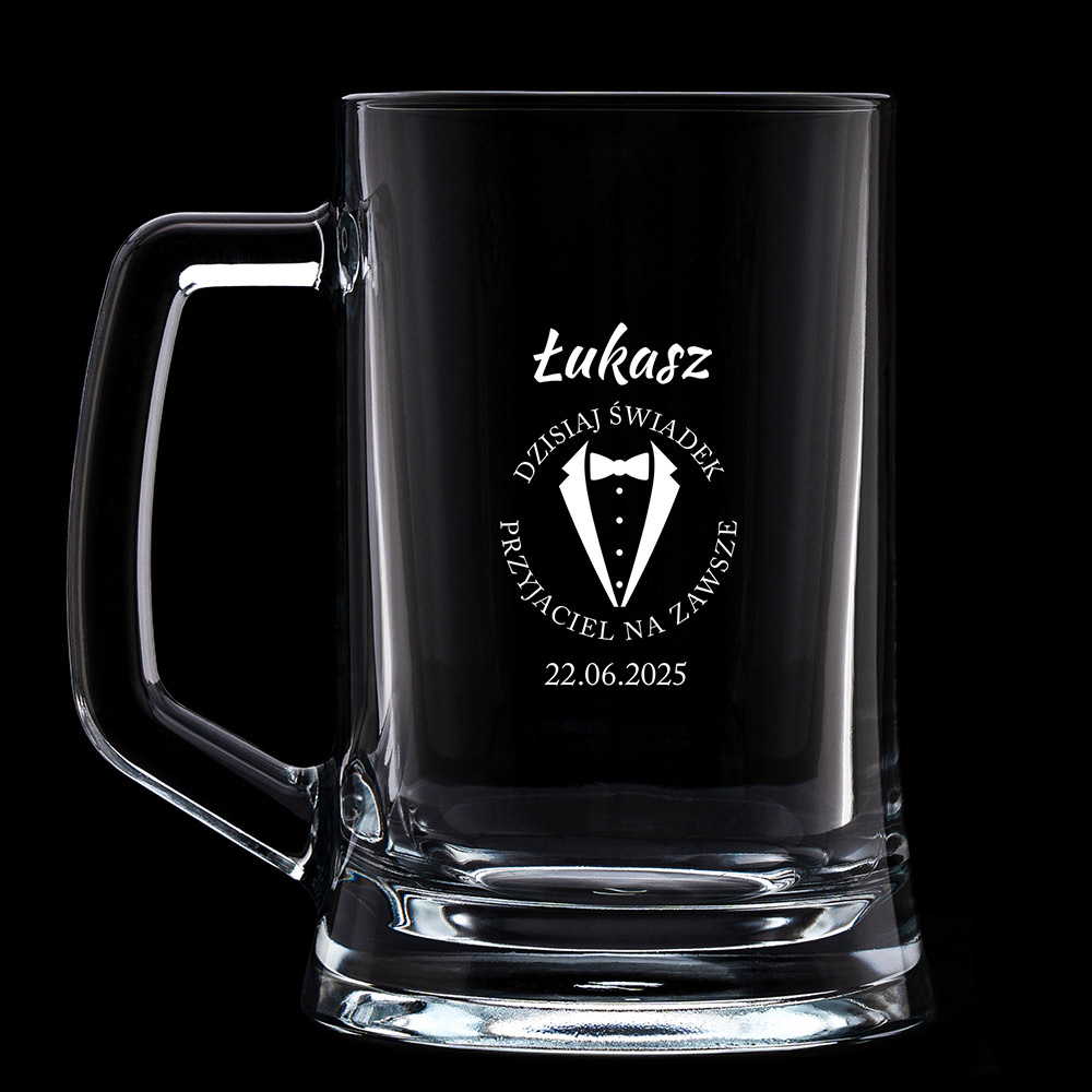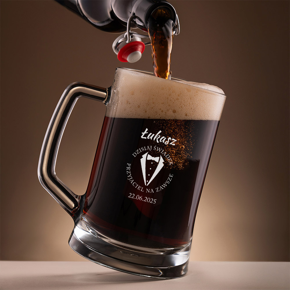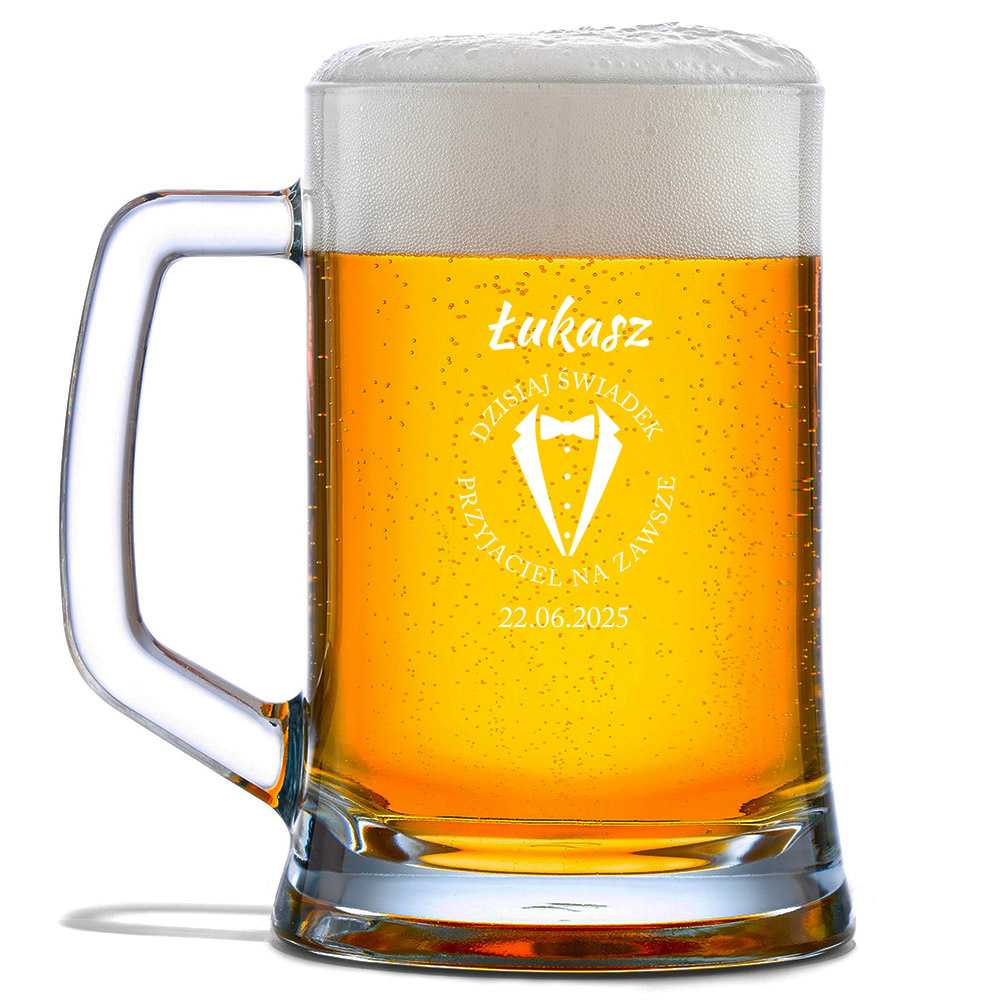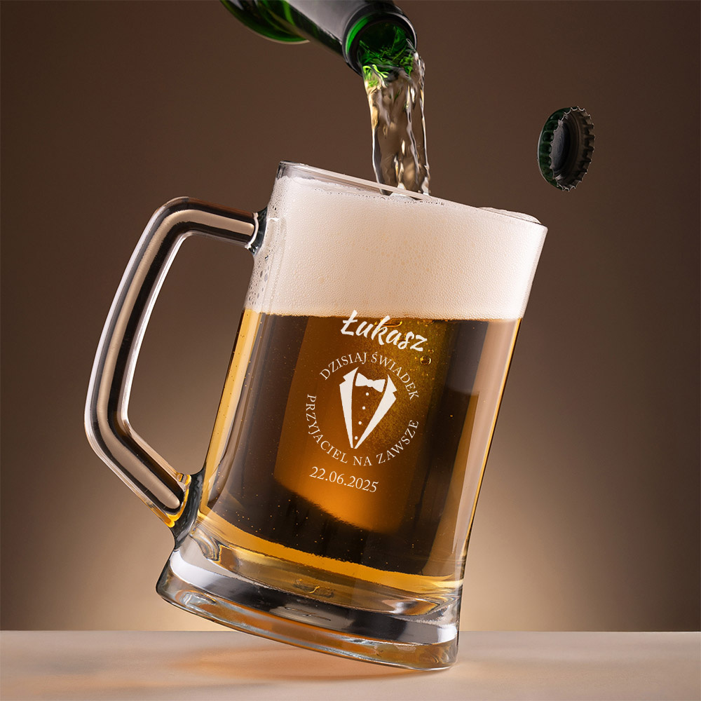 - Stylowy kufel do piwa z personalizowanym grawerem: imię, data oraz napis „Dzisiaj Świadek, Przyjaciel na Zawsze”. Idealny prezent w ramach podziękowań dla świadka za udział w ślubie.