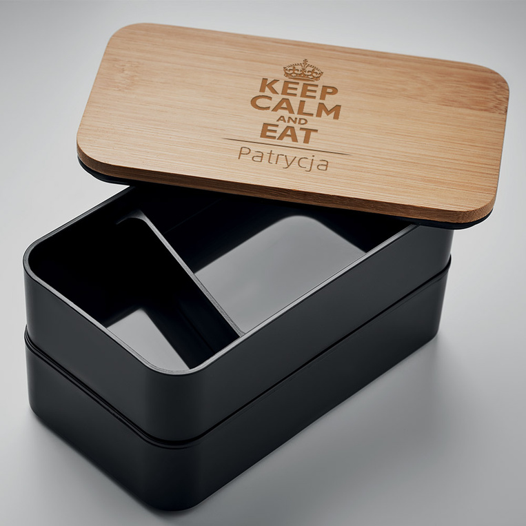 - Stylowy lunch box z bambusową pokrywką i Twoją personalizacją. W zestawie 2 pojemniki, sztućce i opaska. Idealny do pracy, szkoły i na wyjazdy.