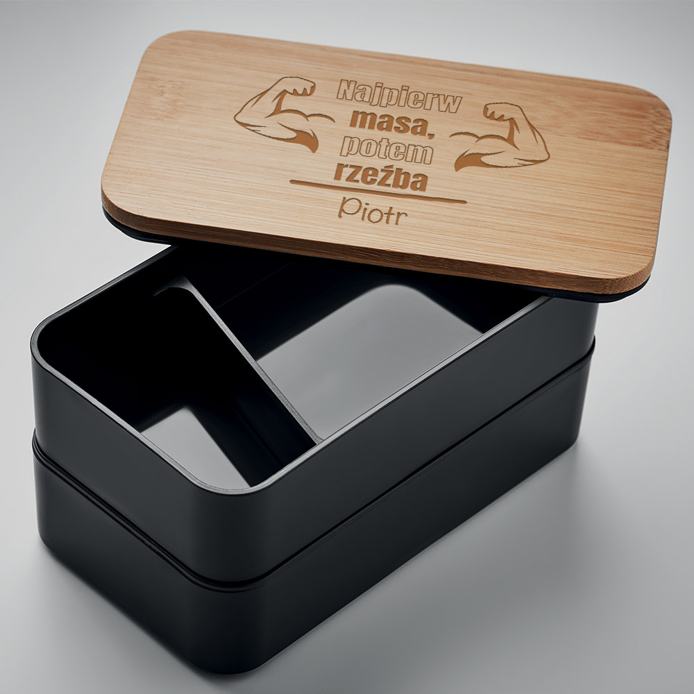Lunch box z grawerem „Najpierw masa, potem rzeźba” oraz imieniem to idealny upominek dla osób, które z dystansem podchodzą do treningów, kochają siłownię i mają poczucie humoru nawet podczas przygotowywania posiłków. Personalizowany grawer nadaje mu wyjątkowy charakter i sprawia, że lunch box świetnie sprawdzi się jako prezent dla sportowca, fana fitnessu, kulturysty czy po prostu osoby dbającej o formę. Kompaktowe pojemniki, wygodne sztućce oraz bambusowa pokrywka sprawiają, że to praktyczny zestaw, który można zabrać do pracy, na uczelnię, do klubu fitness czy na wyjazd. Dzięki solidnemu wykonaniu i humorystycznemu hasłu każdy posiłek będzie przypominam o motywacji i uśmiechu, a zarazem stanie się małą dawką dopingu do dalszych treningów. To świetny prezent na urodziny, imieniny, dla partnera, kolegi z siłowni lub każdego, kto „robi masę”, ale nie zapomina o dobrej zabawie.