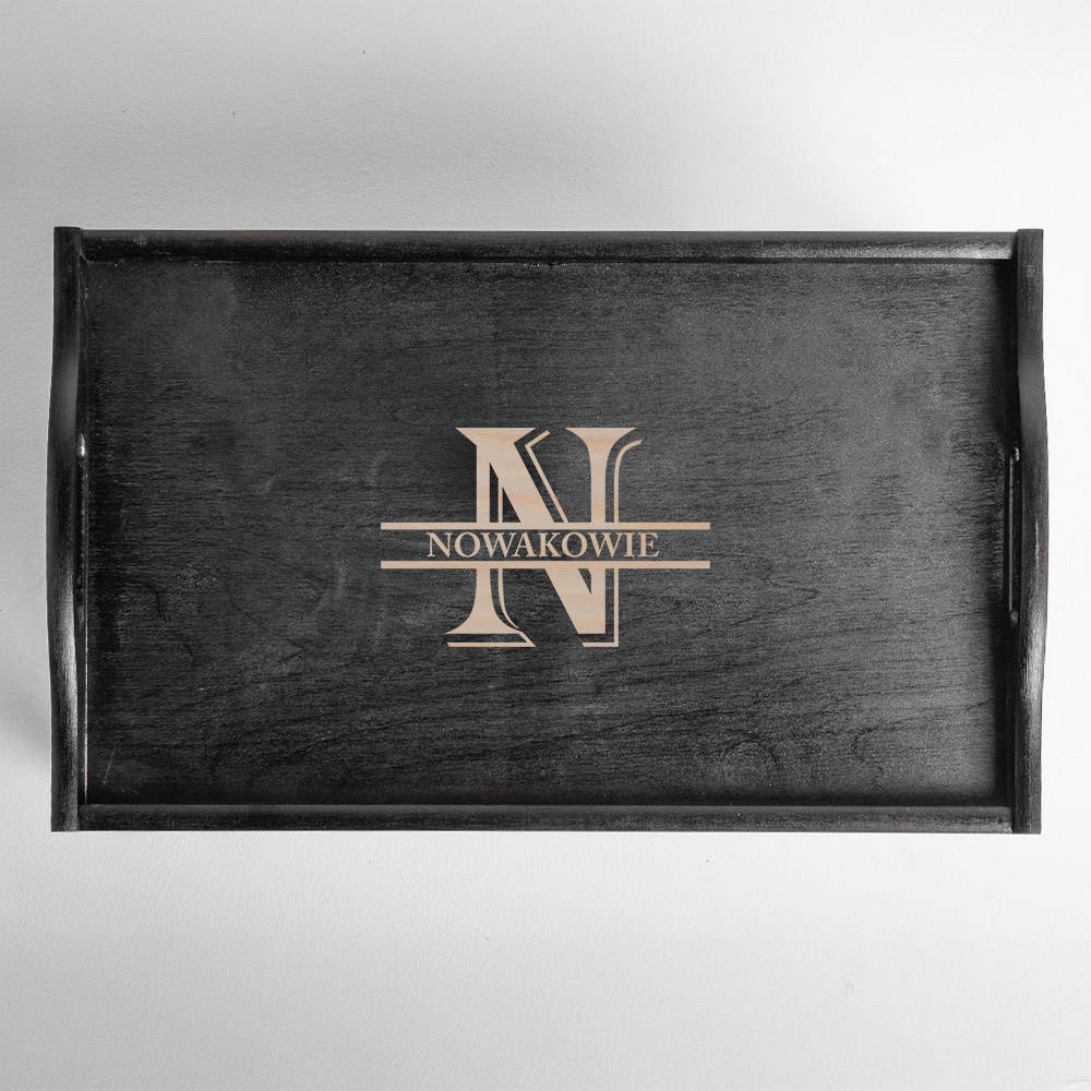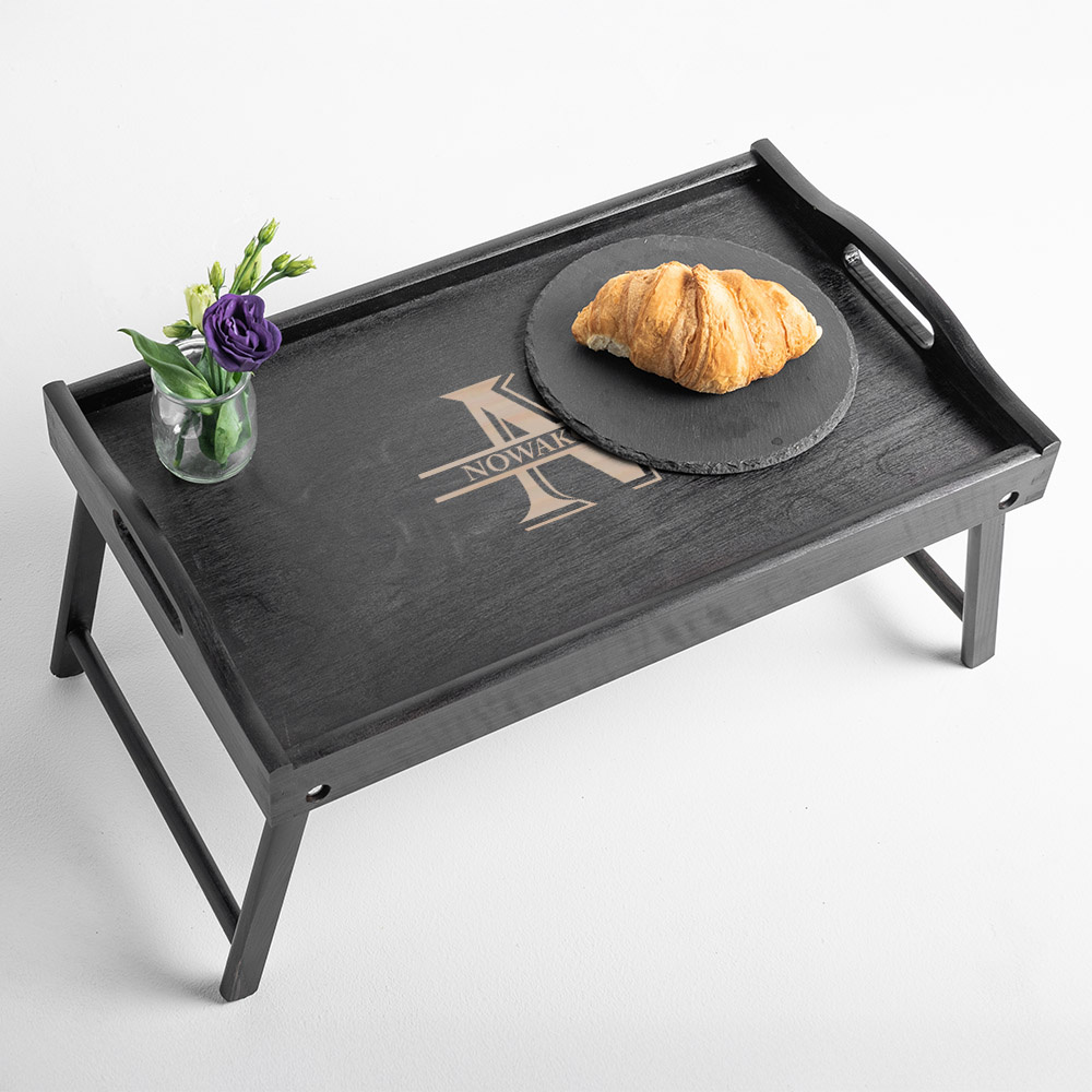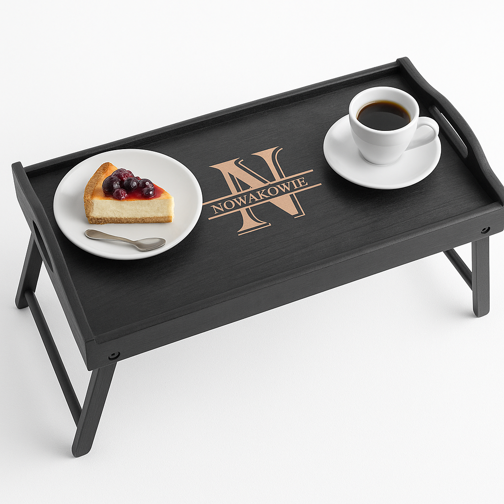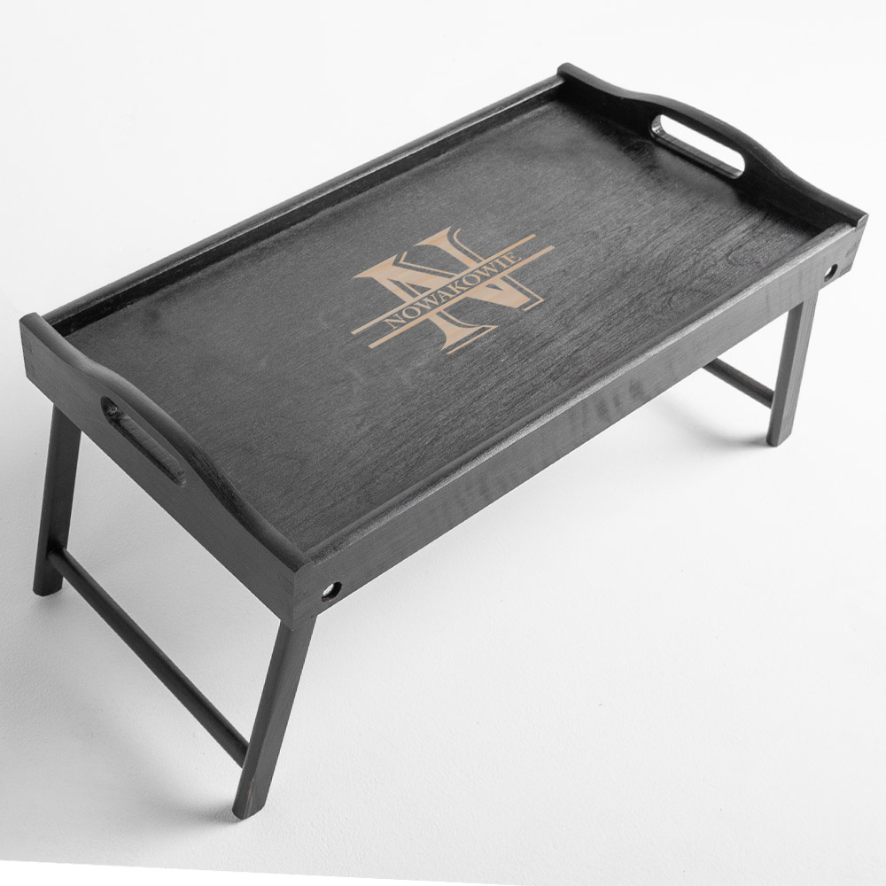 - Stolik śniadaniowy z grawerem monogramu i nazwiska to elegancki i personalizowany prezent z klasą – doskonały na święta, rocznicę, parapetówkę lub jubileusz.