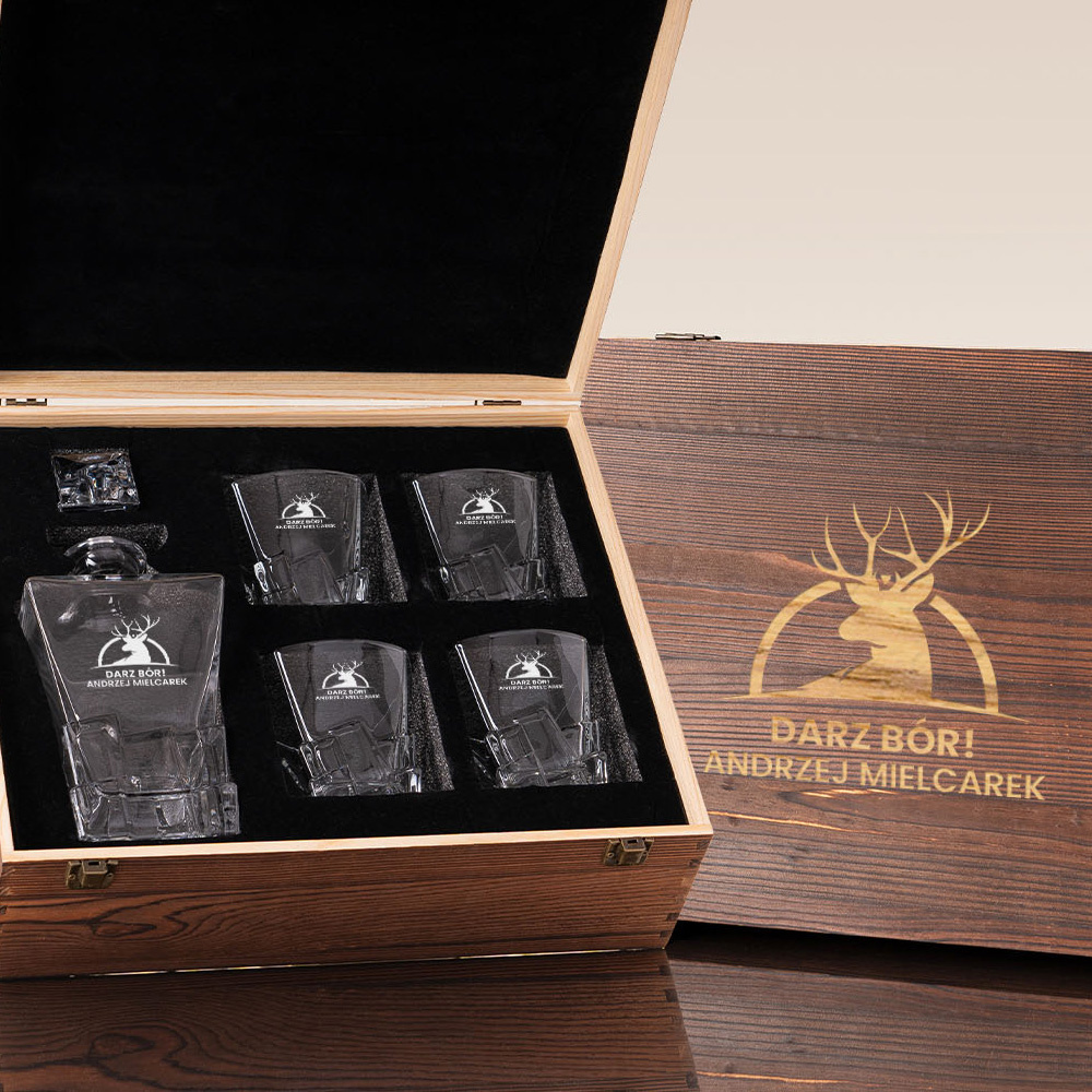 - Personalizowany zestaw do whisky dla leśnika lub myśliwego. Karafka i 4 szklanki z grawerem „Darz Bór”, imieniem i nazwiskiem, w eleganckiej drewnianej skrzynce.