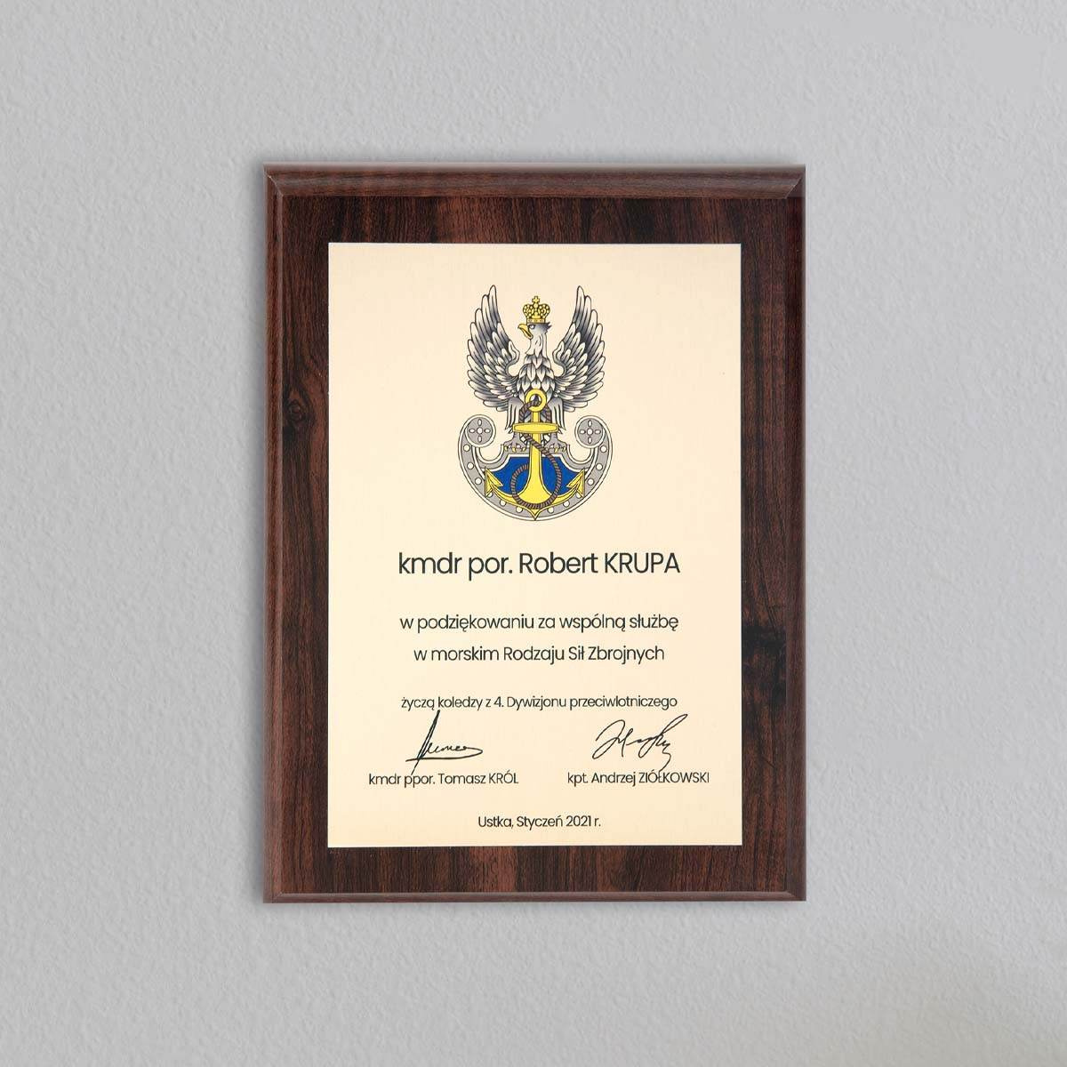 • Podziękowania dla marynarza za służbę z okazji odejścia na emeryturę bądź gratulacje z okazji awansu. Dyplom skłąda się z metalowej płytki z nadrukiem, osadzonej na drewnianym podkładzie.