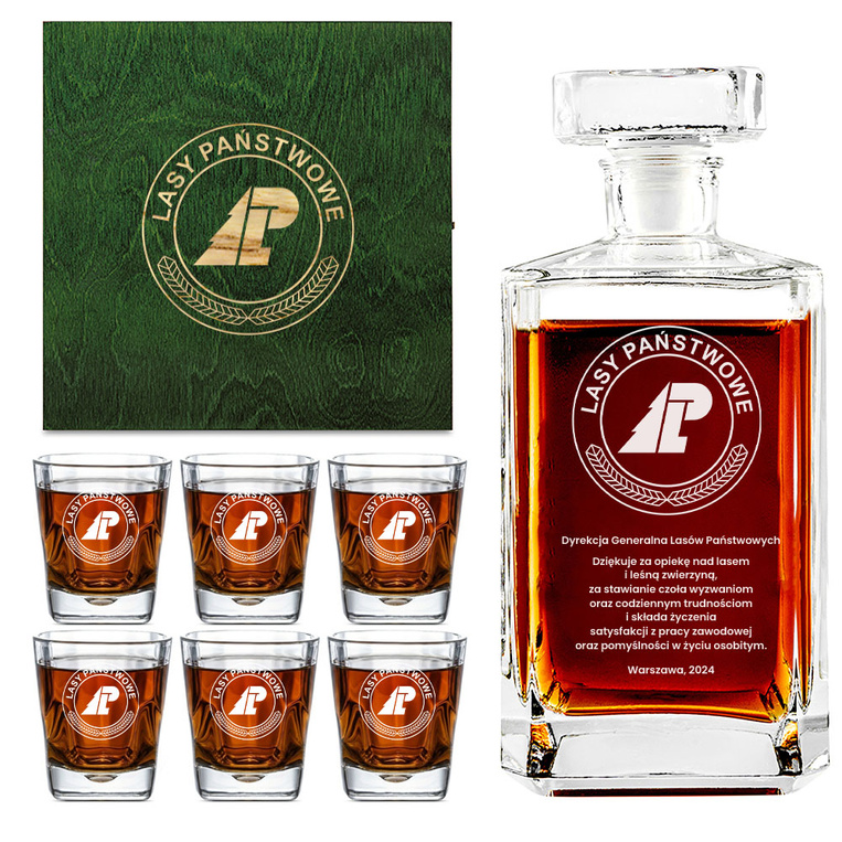 Personalizacja w formie graweru laserowego na każdej szklance dodaje wyjątkowego charakteru. Zestaw jest idealny jako prezent dla leśnika odchodzącego na emeryturę, podziękowanie dla pracownika Lasów Państwowych lub upominek dla miłośnika whisky. Wszystkie szklane elementy można myć w zmywarkach, co zapewnia wygodę użytkowania.