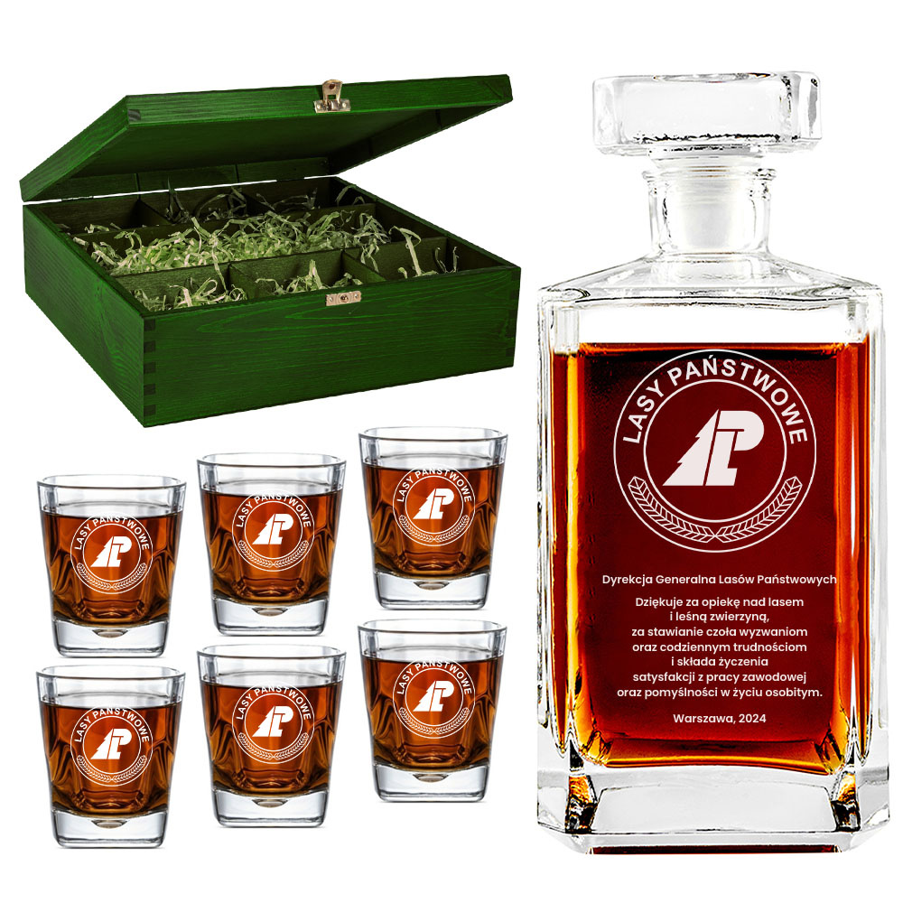 • Zestaw do nalewek i whisky, składający się z karafki i 6 szklanek w eleganckiej, drewnianej zielonej skrzynce. Doskonały prezent dla nadleśniczego lub leśnika na emeryturę. Personalizacja grawerem laserowym.