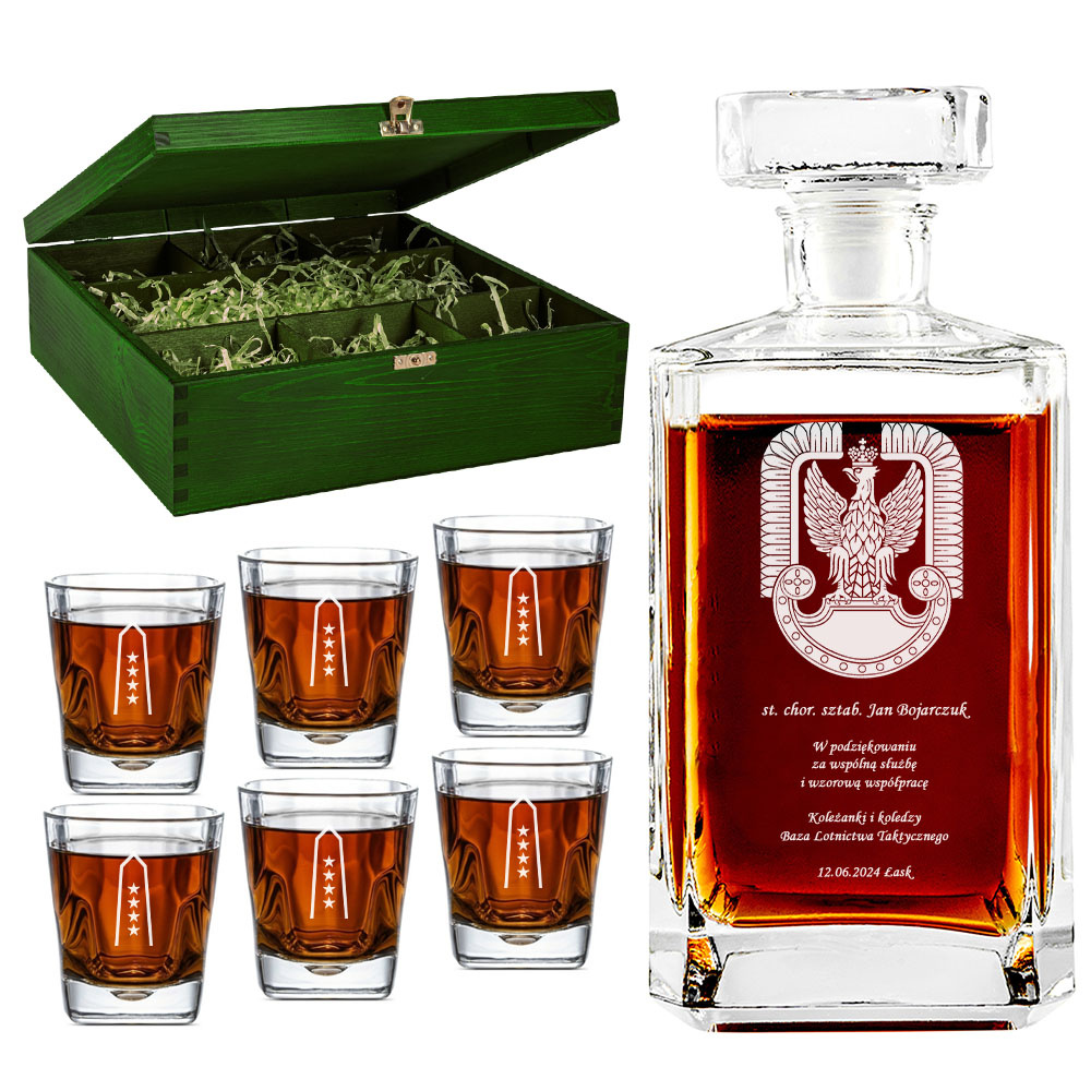 - Grawerowana karafka z 6 szklankami w zielonej drewnianej skrzynce, idealna na prezent dla żołnierza Wojsk Lotniczych. Na każdym elemencie widnieje logotyp Wojsk Lotniczych, a na karafce dodatkowo dedykacja.
