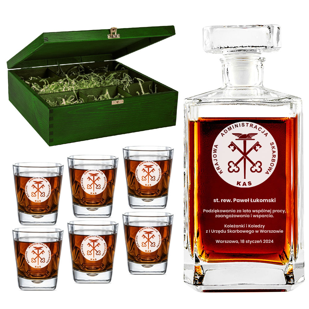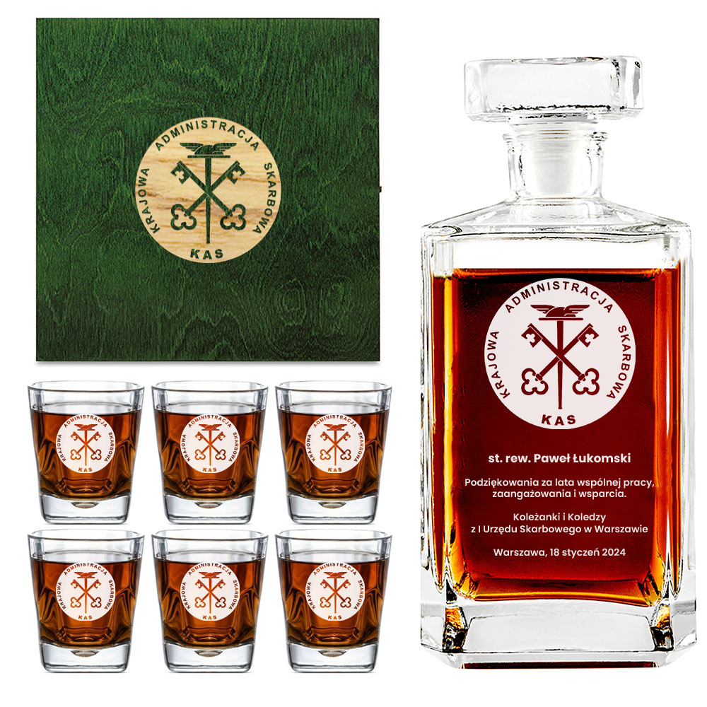 - Grawerowana karafka i sześć szklanek w zielonej drewnianej skrzynce z logotypem KAS to elegancki prezent dla pracownika Krajowej Administracji Skarbowej, który odchodzi na emeryturę. Doskonały upominek na wyjątkową okazję.