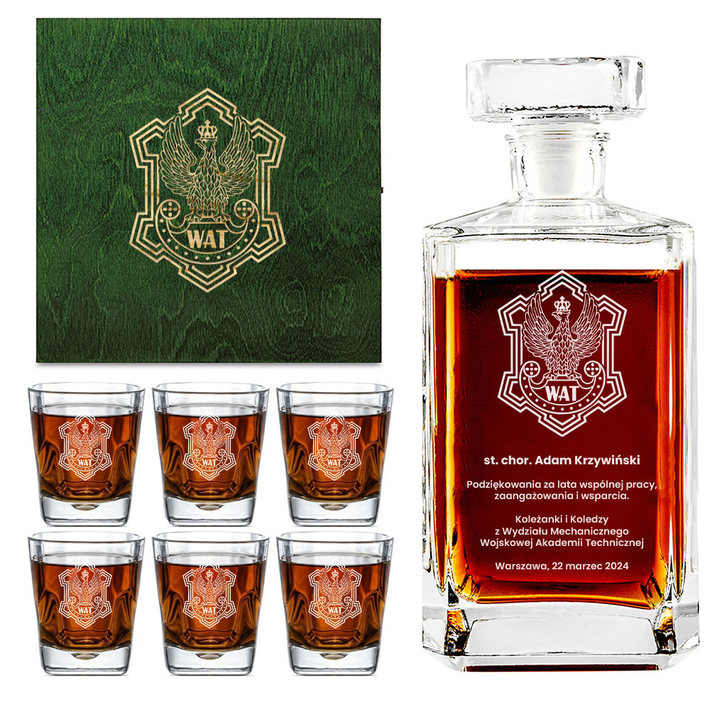 Karafka oraz szklanki zostały ozdobione precyzyjnym, laserowym grawerem, który przedstawia logotyp Wojskowej Akademii Technicznej. Na karafce dodatkowo znajduje się dedykacja, nadająca całości indywidualny charakter. Zestaw ten sprawdzi się doskonale jako prezent dla smakosza whisky, podkreślając jego gust i zamiłowanie do eleganckich dodatków. To także doskonały wybór na upominek z okazji zakończenia kariery wojskowej, który pozostanie trwałą pamiątką na długie lata.