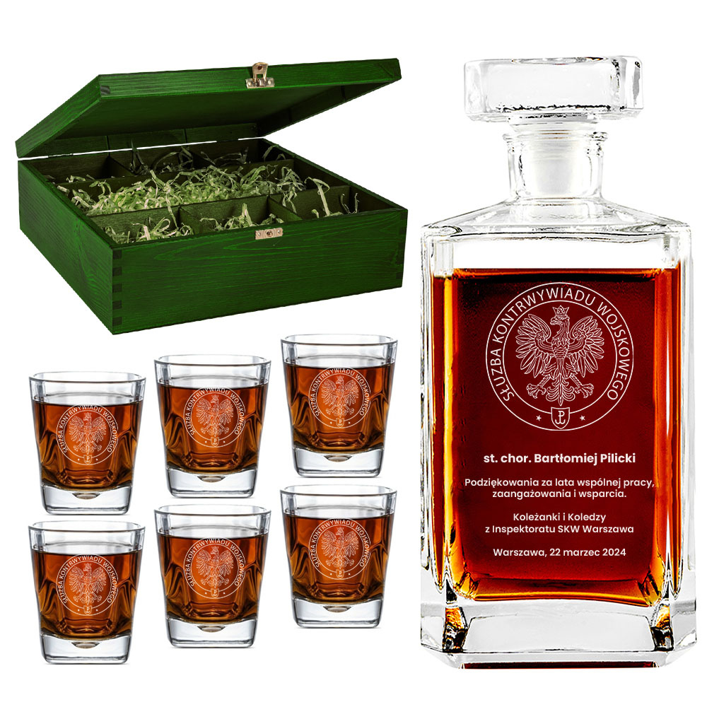 - Grawerowana karafka i 6 szklanek w eleganckiej, zielonej drewnianej skrzynce. Doskonały prezent dla żołnierza Służb Kontrwywiadu Wojskowego, szczególnie na pożegnanie związane z przejściem na emeryturę. Na karafce dedykacja oraz logotyp SKW.
