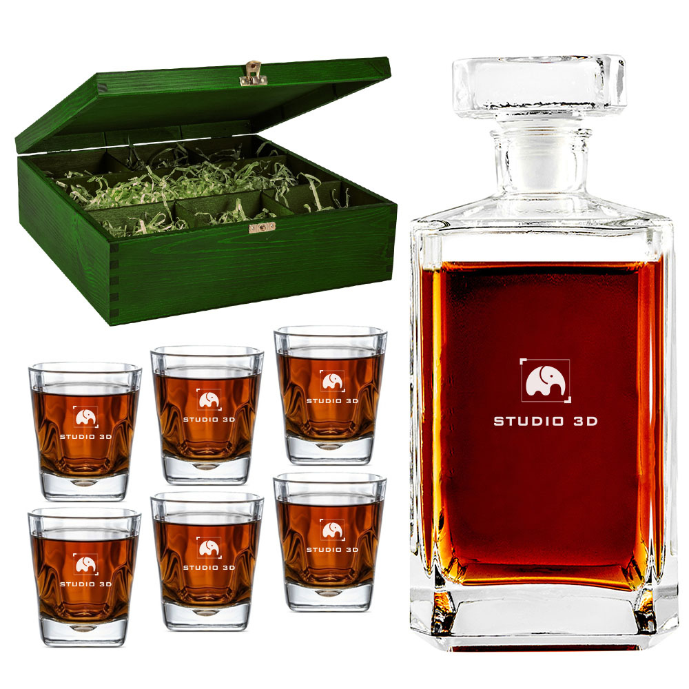 Szukasz eleganckiego prezentu firmowego na święta? Grawerowana karafka z 6 szklankami w drewnianej, zielonej skrzynce to doskonały sposób na wyrażenie wdzięczności klientom, pracownikom i partnerom biznesowym. Zestaw wyróżnia się personalizacją – na skrzynce znajduje się świąteczna grafika i logo Twojej firmy, a na karafce i szklankach starannie wykonany laserowy grawer z logo. To nie tylko estetyczny upominek, ale również praktyczny – idealny do serwowania whisky, koniaku czy wody.
