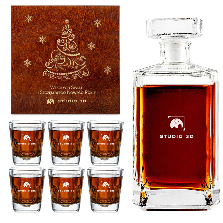 • Zestaw prezentowy: karafka i 6 szklanek w drewnianej skrzynce. Personalizowany grawer świąteczny i logo na skrzynce, karafce i szklankach. Prezent firmowy na święta dla klientów, pracowników i partnerów.