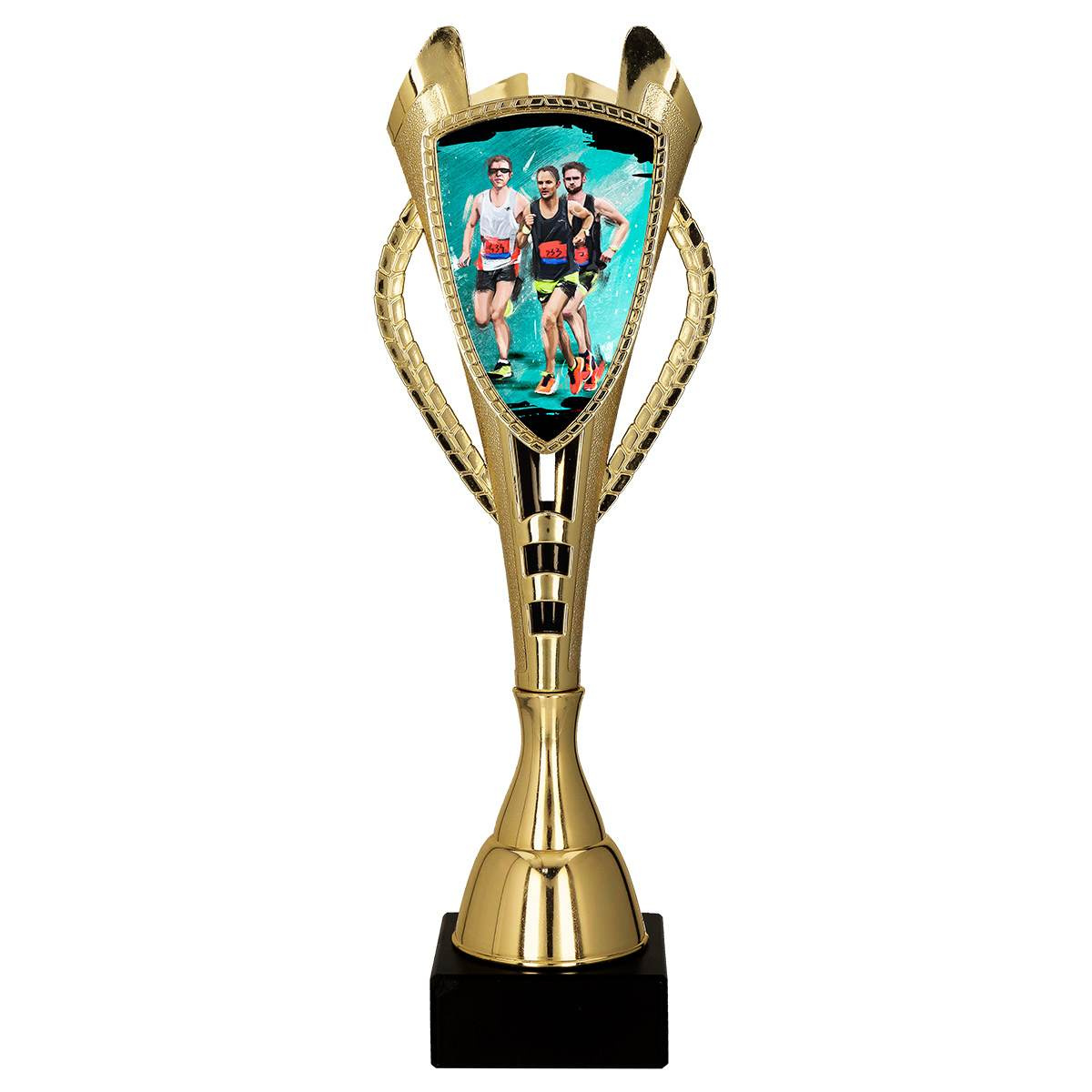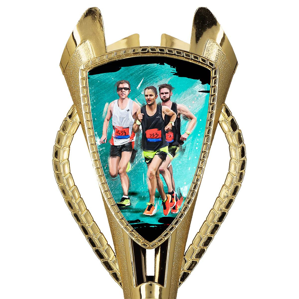 - Personalizowany złoty puchar z grafiką dotyczącą zawodów biegowych w kształcie tarczy. Wysokość pucharu 41.5 cm. Możliwość personalizacji na tabliczce.