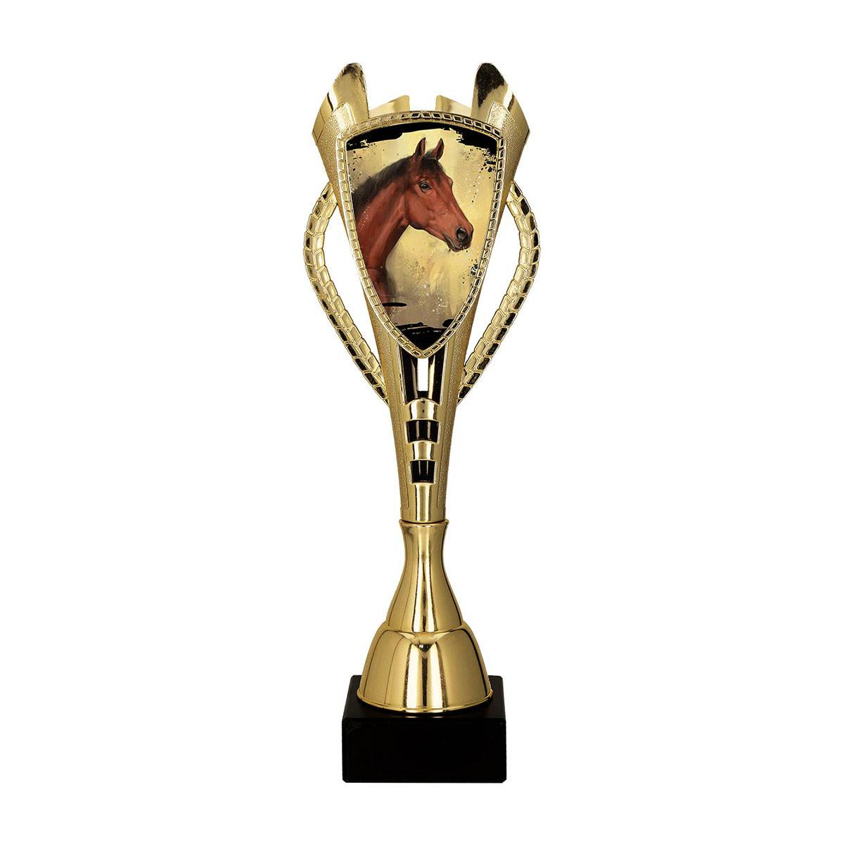 - Nowoczesny puchar z dedykowaną grafiką z koniem. Idealna nagroda na zawody jeżdżieckie.