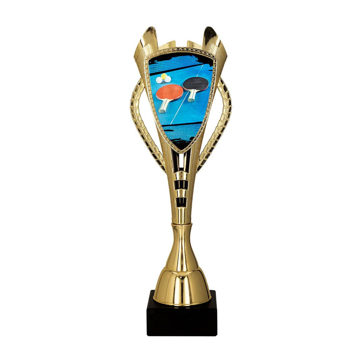 - Puchar z grawerem dedykowany dla tenisistów na turniej ping ponga. Wysokość 40.5 cm. Możliwość personalizacji tabliczką z grawerem.