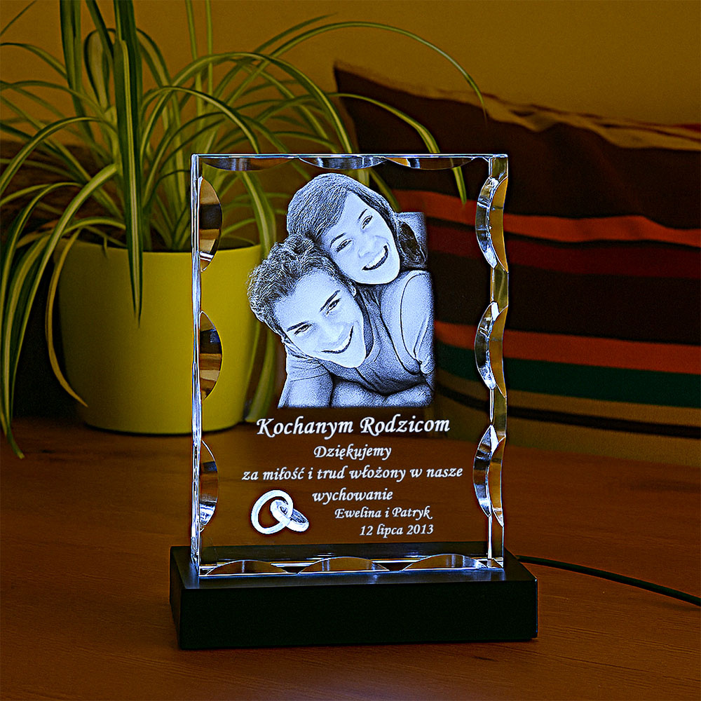- Personalizowany fotokryształ 3D z trójwymiarowym grawerunkiem zdjęcia i podstawką LED. Idealny prezent rocznicowy – trwały, efektowny i wykonany z precyzją laserową.