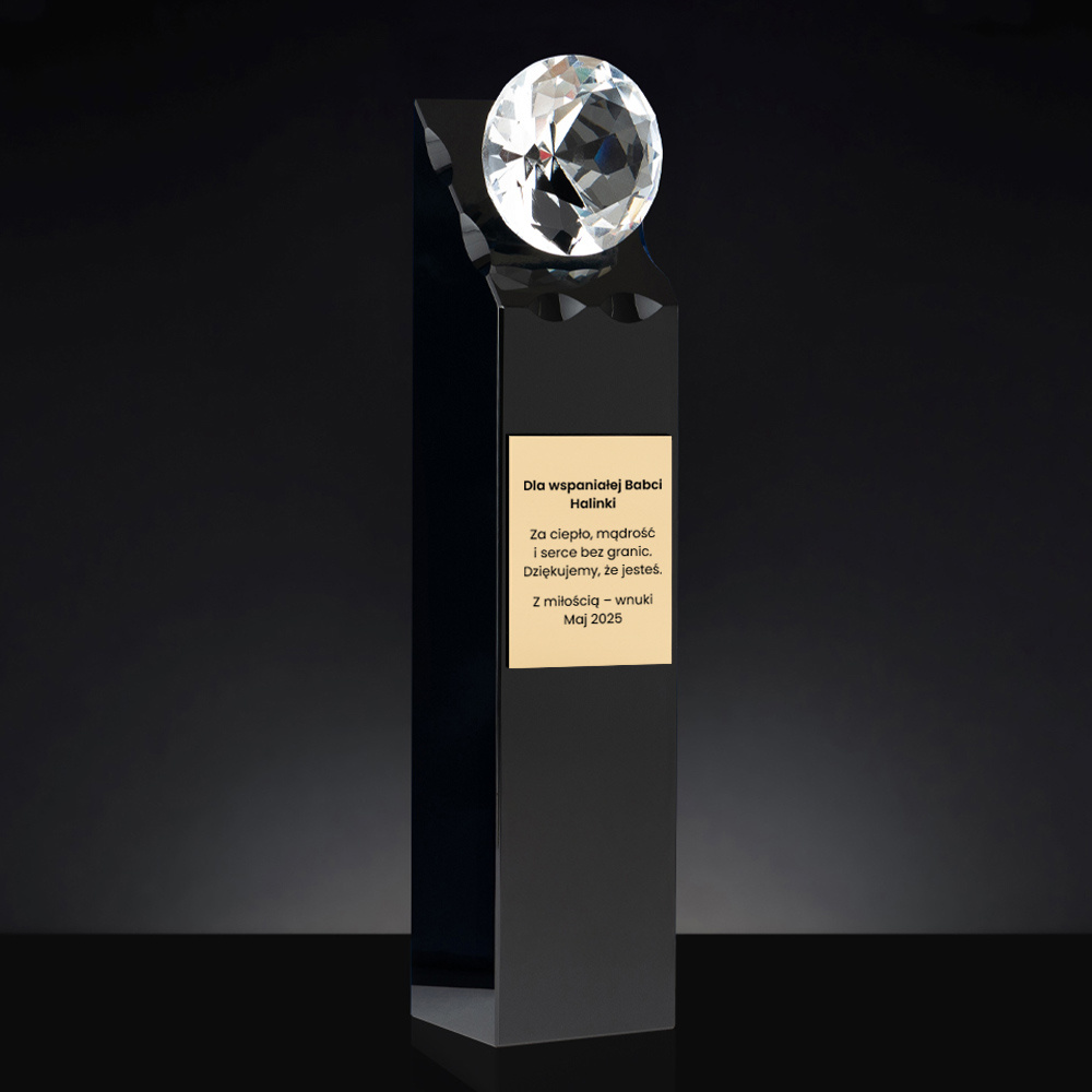 - Ekskluzywna statuetka z czarnego szkła z diamentem i złotą tabliczką z grawerem: Dla wspaniałej Babci. Za ciepło, mądrość i serce bez granic. Z okazji imienin, urodzin czy Dnia Babci.