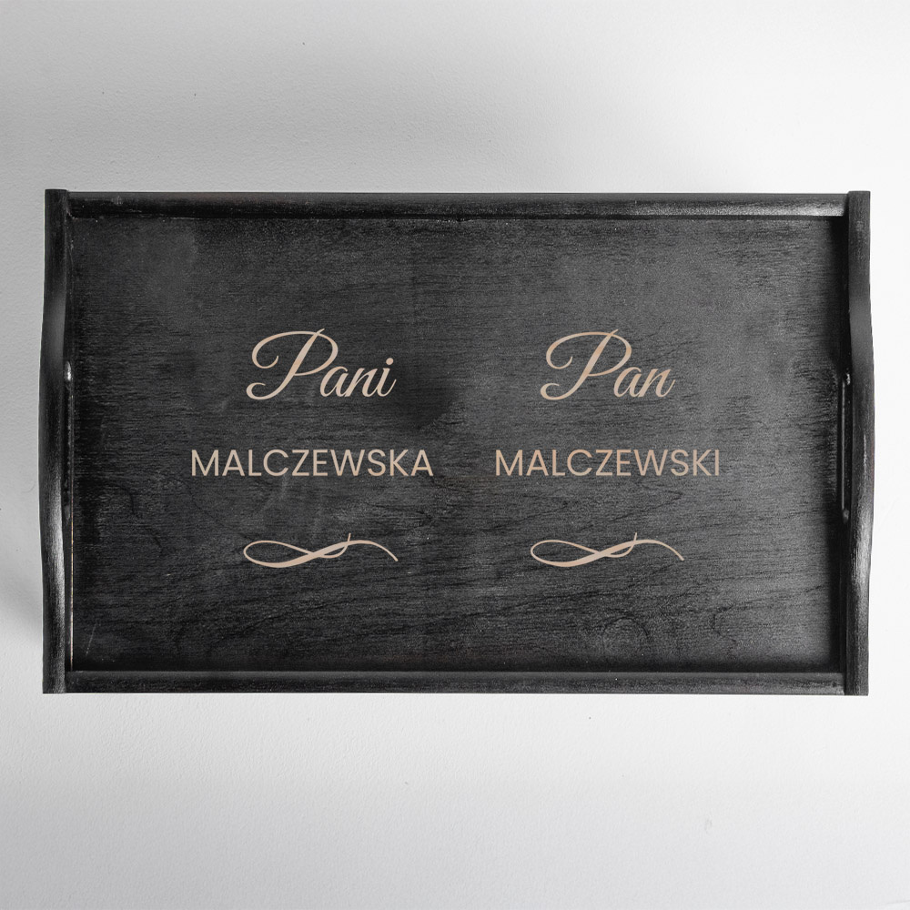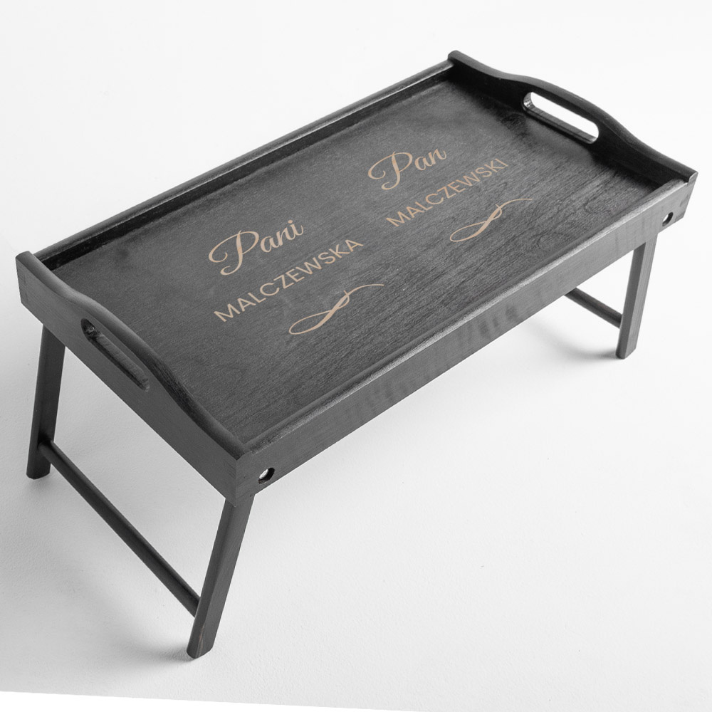 - Czarny stolik śniadaniowy z grawerem „Pani i Pan + nazwisko” to wyjątkowy prezent dla pary – z okazji ślubu, rocznicy, parapetówki lub świąt. Nazwisko podaje kupujący.