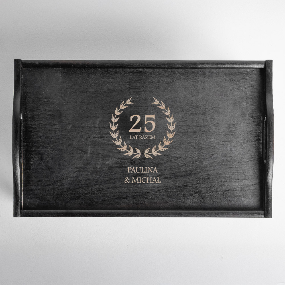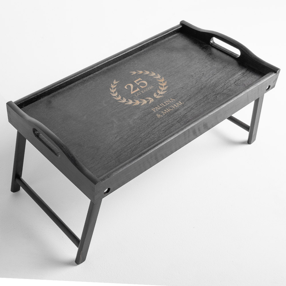 Stylowy stolik śniadaniowy z grawerem to elegancki prezent dla dwojga. Grawerowane napisy mogą zostać spersonalizowane – klient podaje personalizację czyli jubileusz oraz imiona w celu wygrawerowania na stoliku. Wykonany z drewna sosnowego, z praktycznymi składanymi nóżkami, stolik doskonale sprawdzi się podczas śniadań w łóżku, relaksu w salonie czy na tarasie. To idealny upominek dla pary z okazji rocznicy ślubu. Personalizacja nadaje mu unikalny charakter, a elegancki czarny kolor podkreśla nowoczesny styl prezentu.