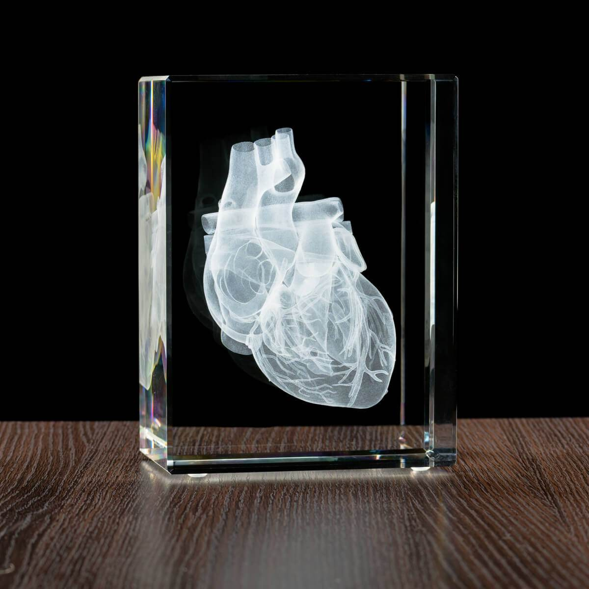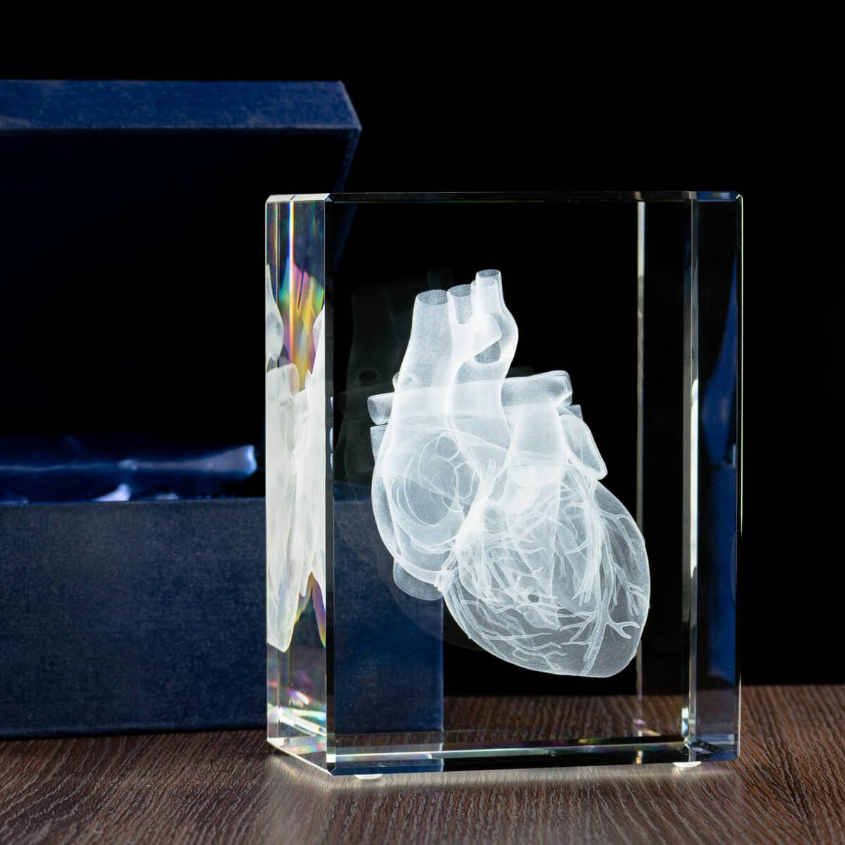 - Szklana statuetka z trójwymiarowym sercem na podstawce LED z funkcją lampki nocnej. Wykonana metodą laserowego grawerowania 3D, waży 7,3 kg z etui i zachwyca detalem wykonania.
